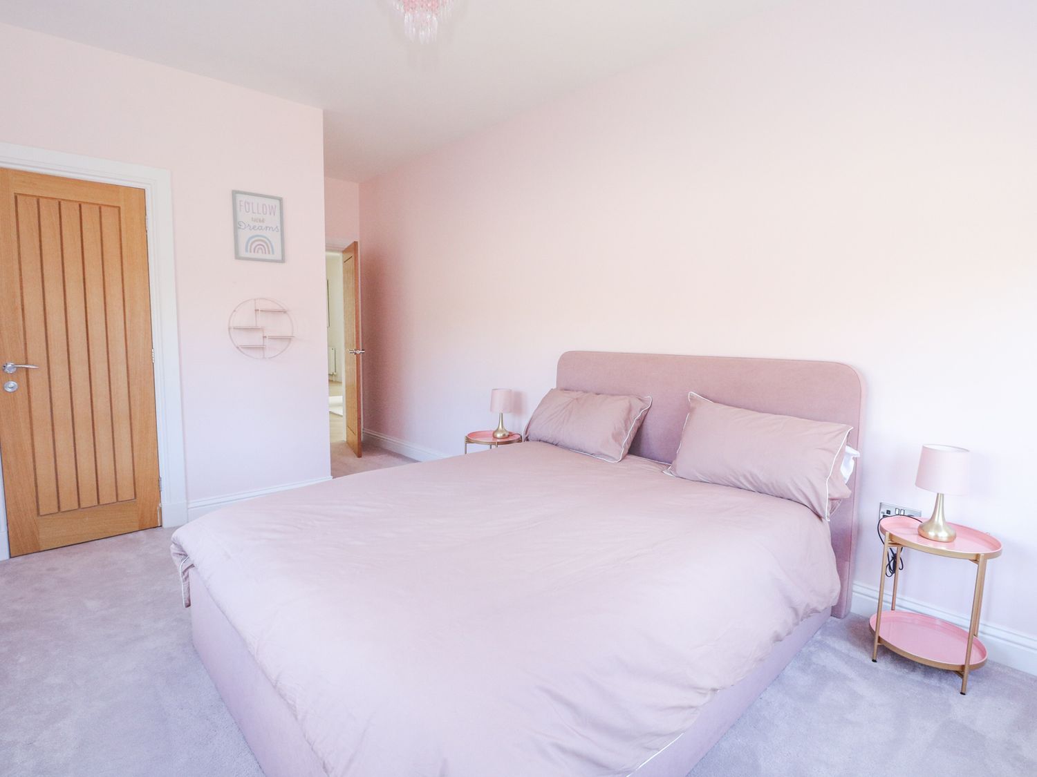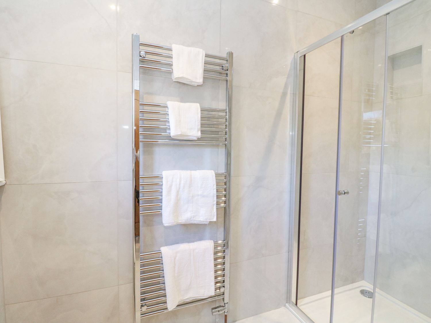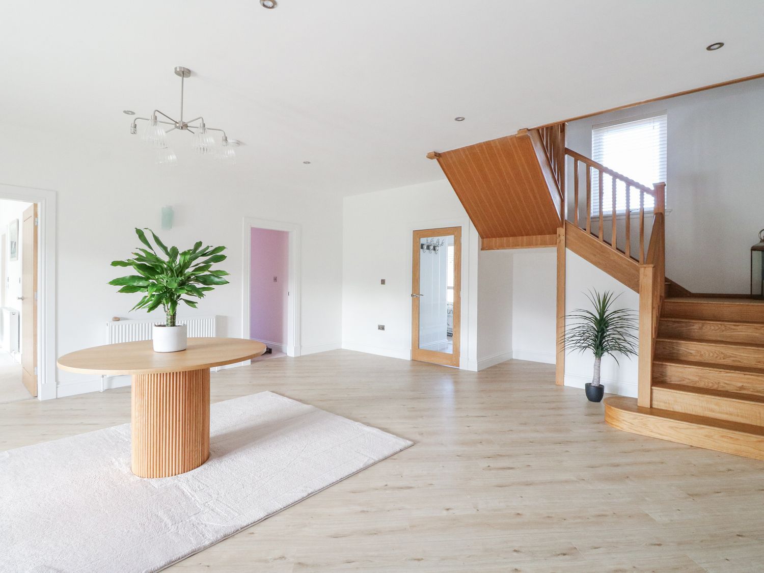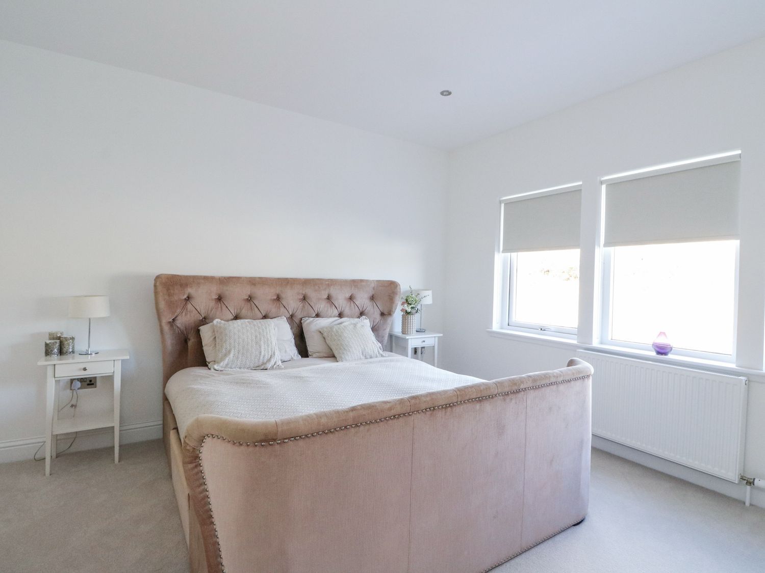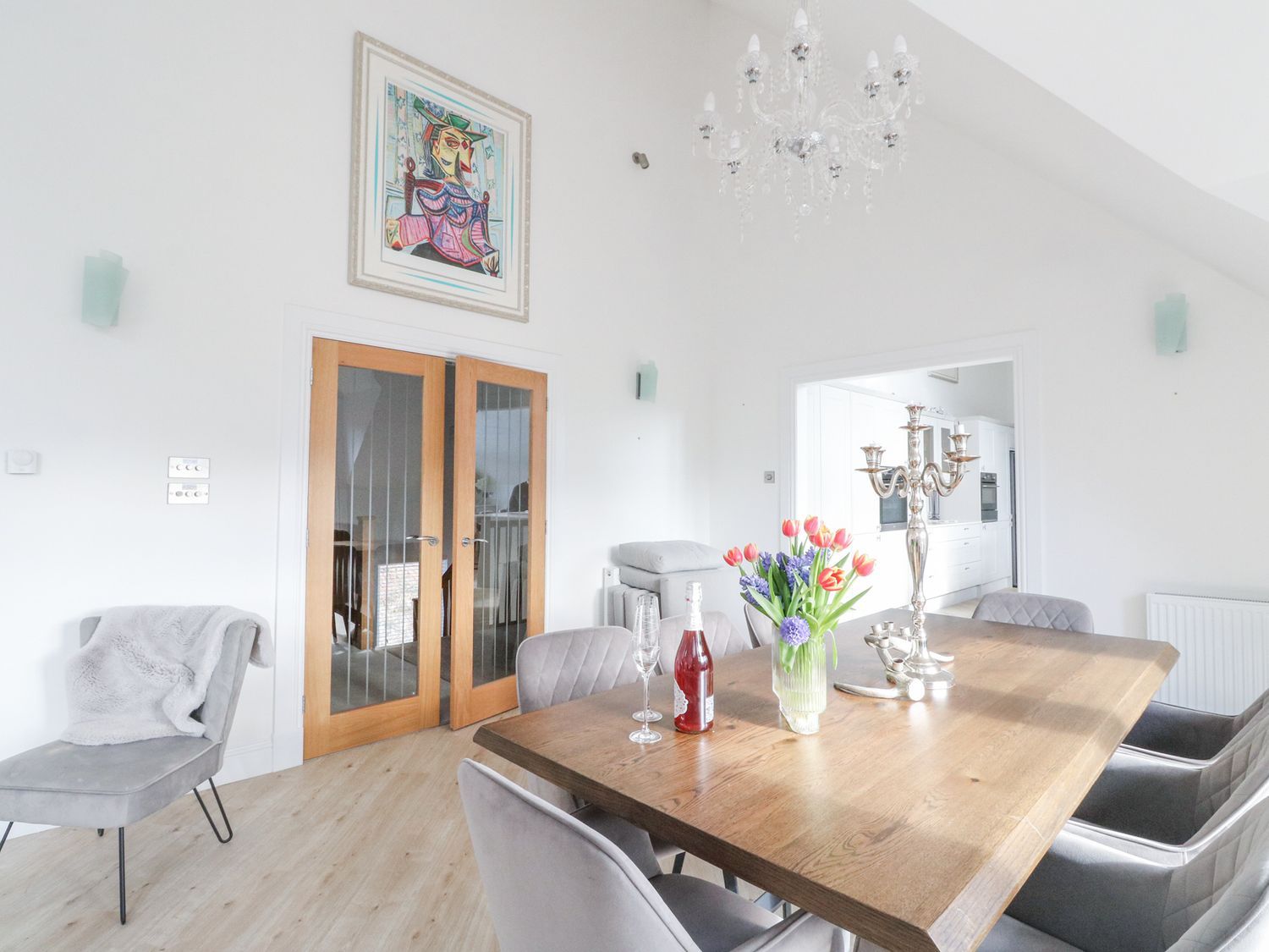 "Reverse-level. Five bedrooms. 1 x ground-floor super-king-size with Smart TV, woodburning stove, free-standing bath, and en-suite walk-in shower, basin, heated towel rail, and WC, 1 x ground-floor super-king-size with en-suite walk-in shower, basin, heated towel rail, and WC., 1 x ground-floor king-size with en-suite walk-in shower, heated towel rail, basin, and WC, 1 x super-king-size with en-suite walk-in shower, heated towel rail, basin, and WC, 1 x king-size with TV and en-suite with bath, shower over, basin, and WC. Cloakroom with basin and WC. 2 x first-floor cloakroom with basin and WC. Kitchen/diner. Utility. Sitting room. First-floor open-plan living space with kitchen, dining area, and sitting area with woodburning stove and access to balcony with furniture. Please note this property only accepts booking checking in on a Saturday for bookings of a week long. "