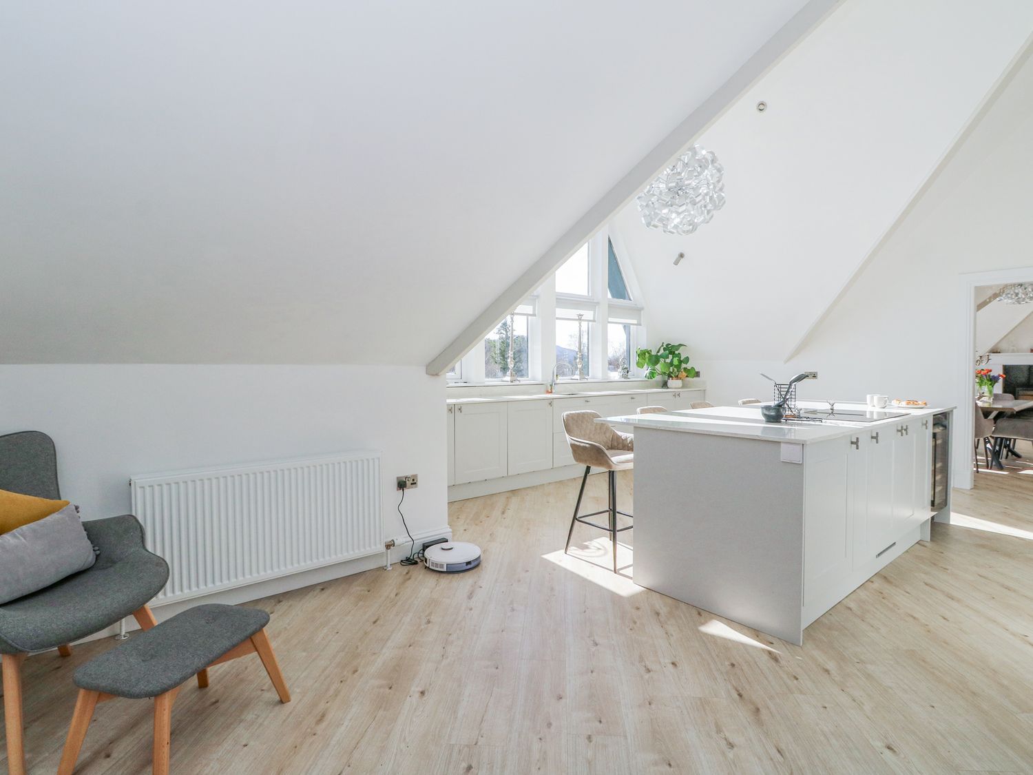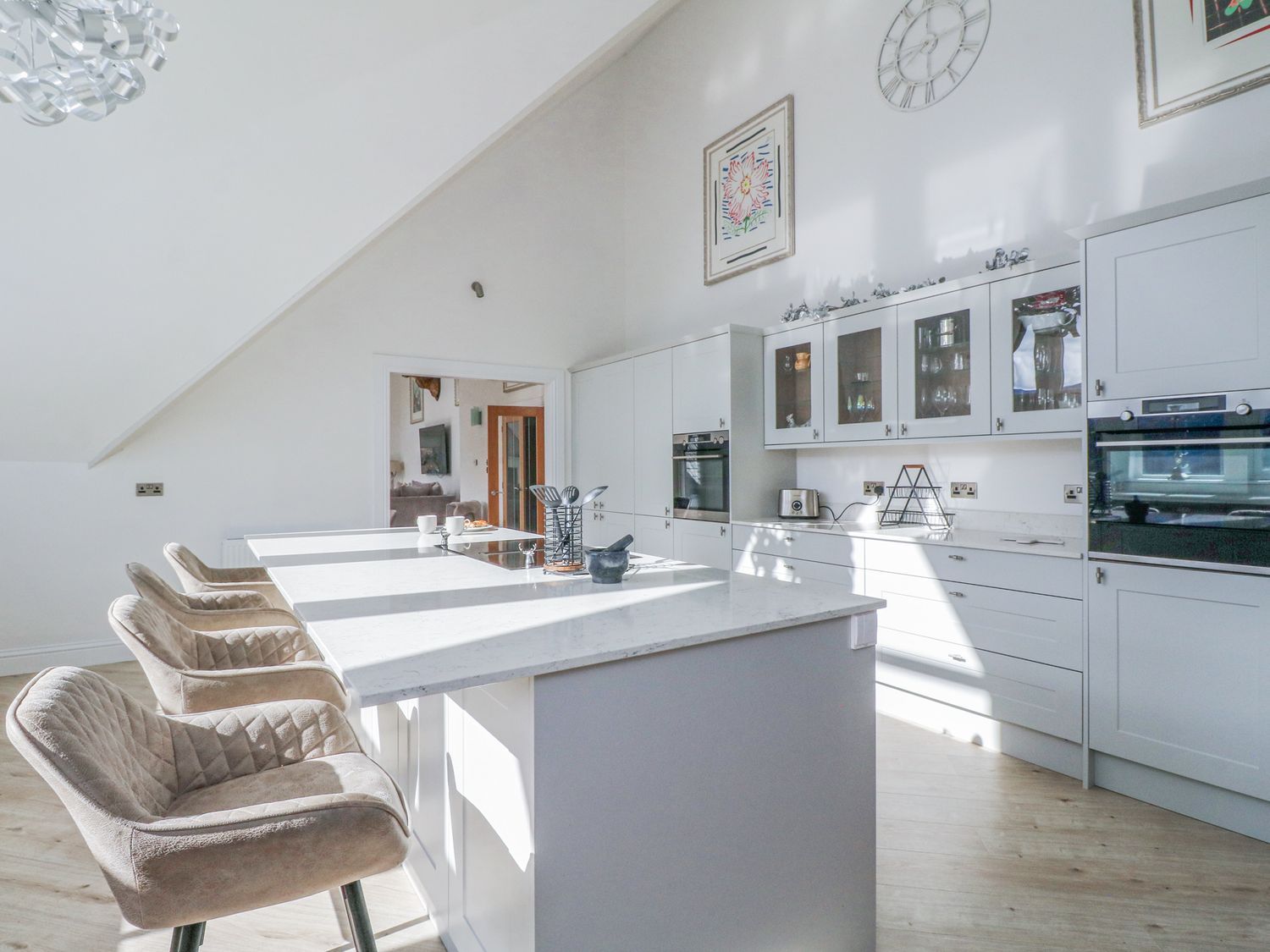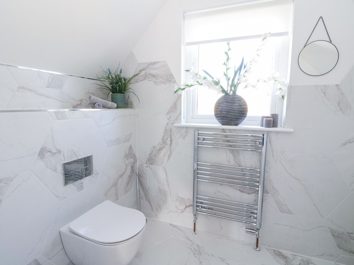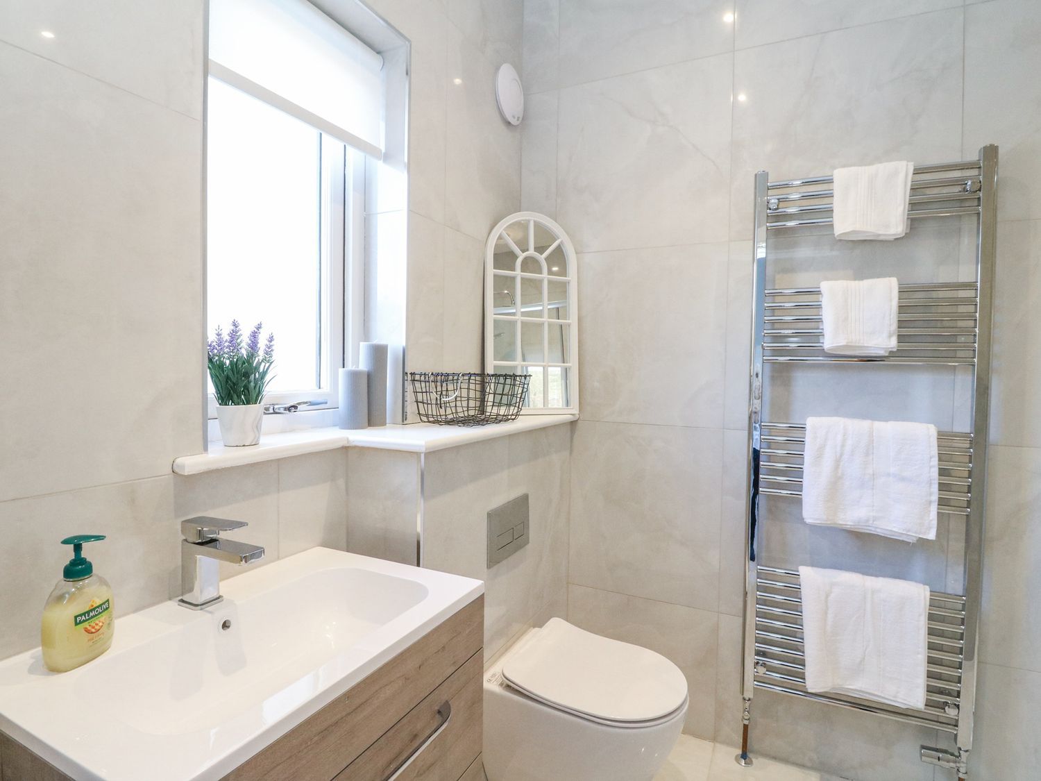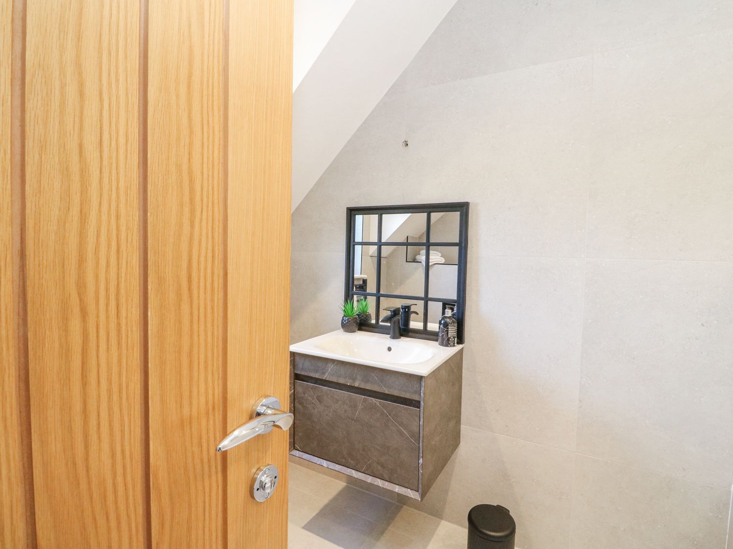 "Reverse-level. Five bedrooms. 1 x ground-floor super-king-size with Smart TV, woodburning stove, free-standing bath, and en-suite walk-in shower, basin, heated towel rail, and WC, 1 x ground-floor super-king-size with en-suite walk-in shower, basin, heated towel rail, and WC., 1 x ground-floor king-size with en-suite walk-in shower, heated towel rail, basin, and WC, 1 x super-king-size with en-suite walk-in shower, heated towel rail, basin, and WC, 1 x king-size with TV and en-suite with bath, shower over, basin, and WC. Cloakroom with basin and WC. 2 x first-floor cloakroom with basin and WC. Kitchen/diner. Utility. Sitting room. First-floor open-plan living space with kitchen, dining area, and sitting area with woodburning stove and access to balcony with furniture. Please note this property only accepts booking checking in on a Saturday for bookings of a week long. "