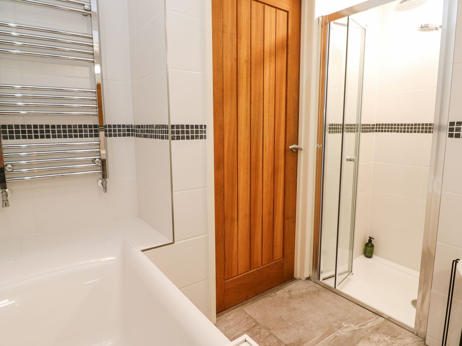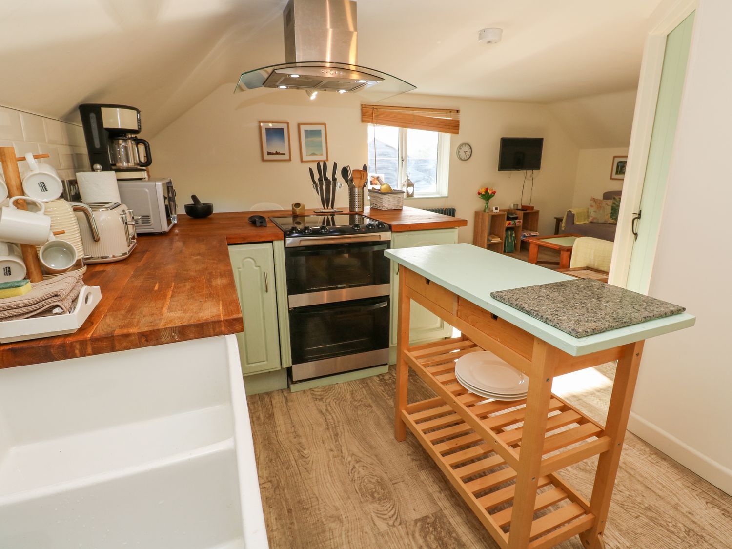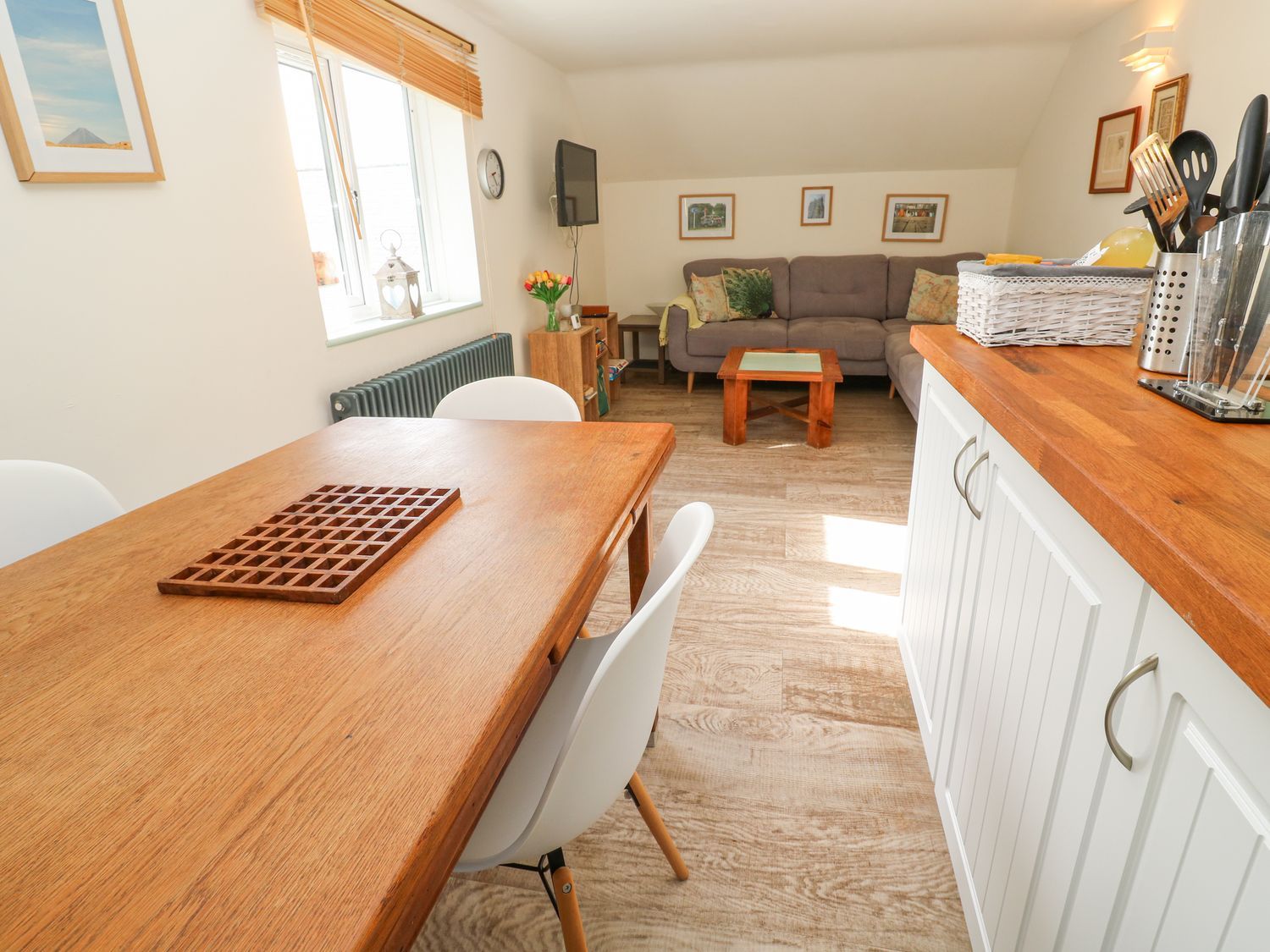 "Three bedrooms: 1 x double, 1 x ground-floor double with basin, 1 x ground-floor single. Shower room with walk-in shower, basin and WC. Ground-floor bathroom with bath, walk-in shower, basin and WC. First-floor open-plan living area with kitchen, dining and sitting area"