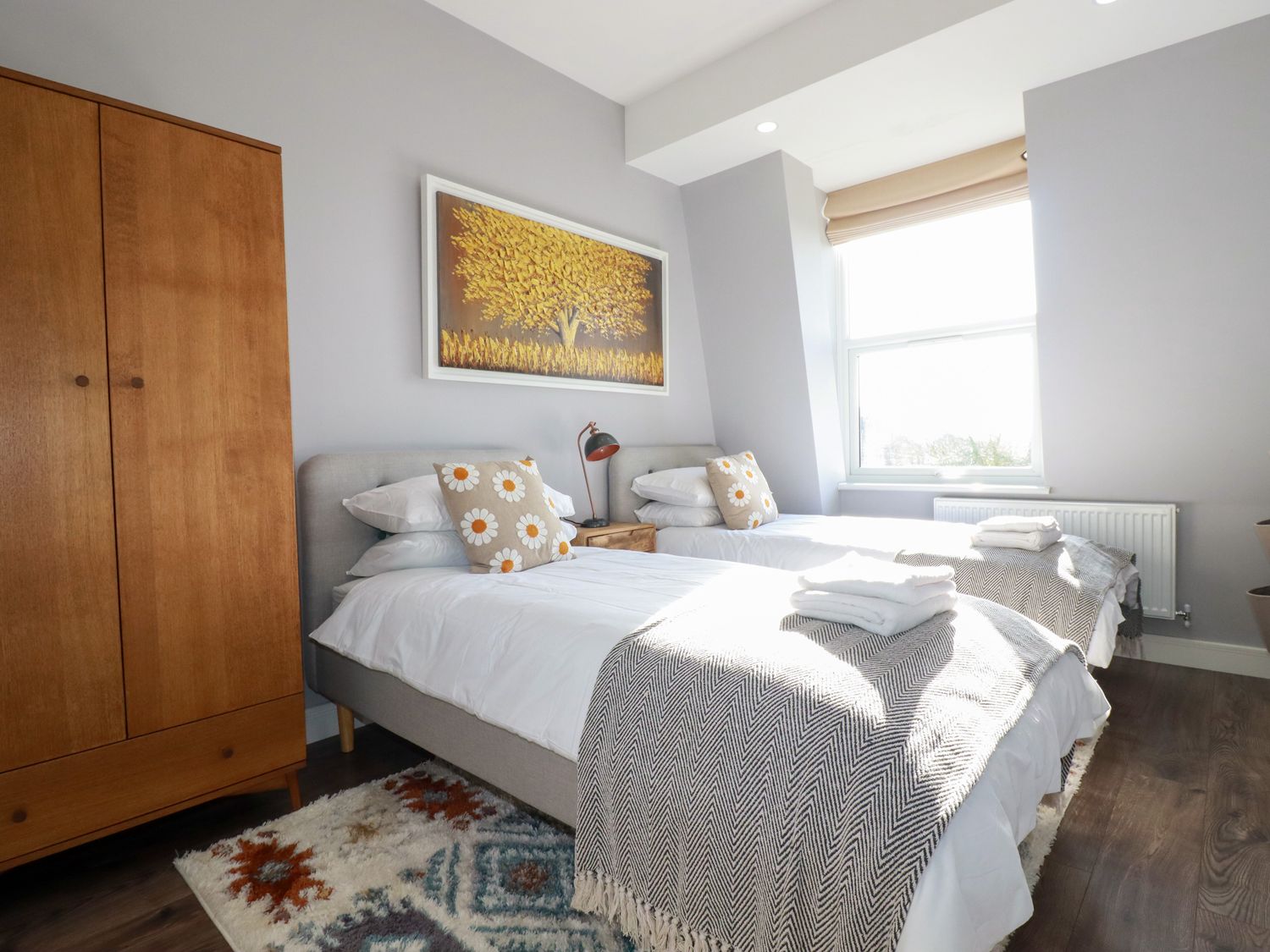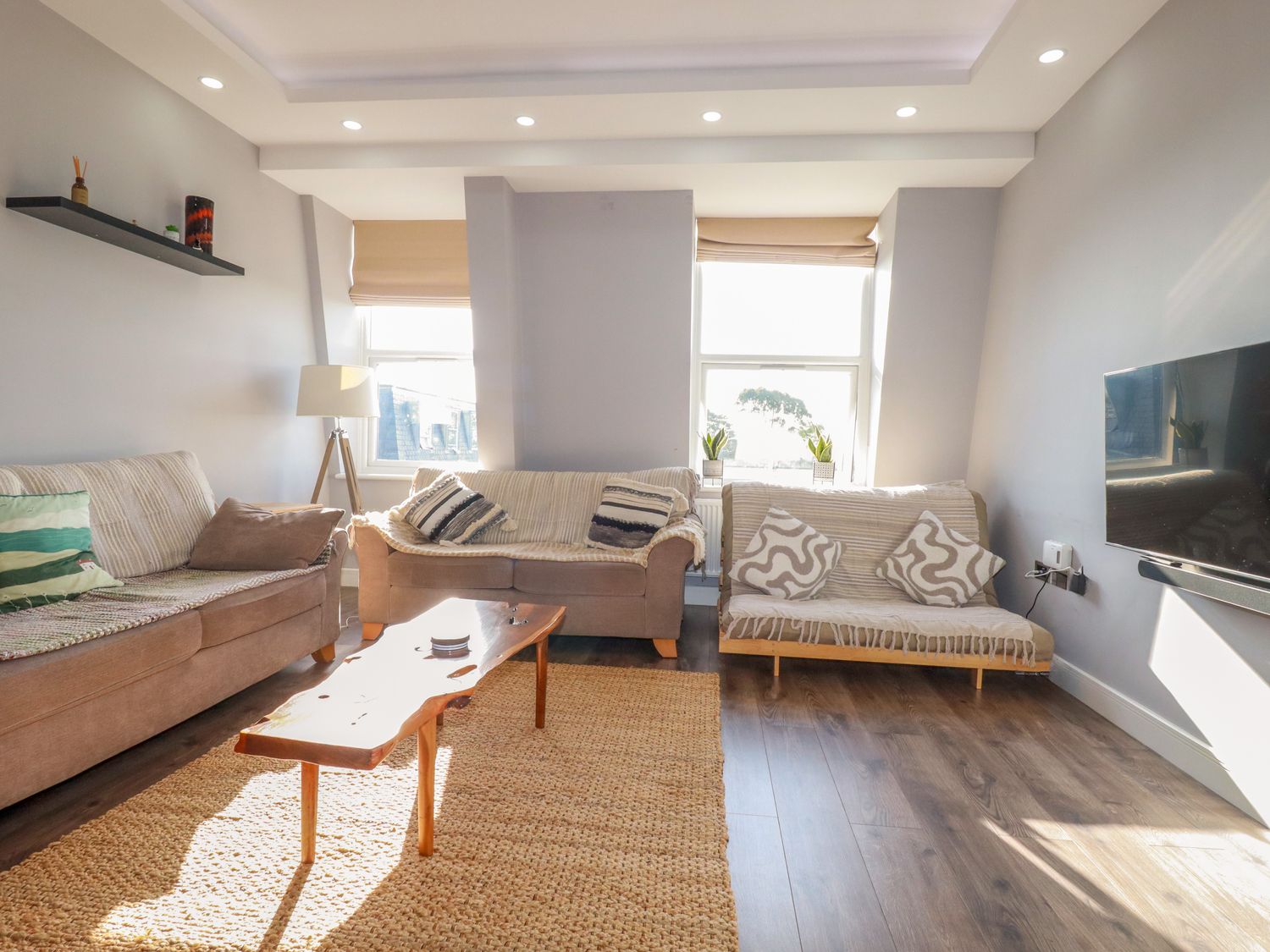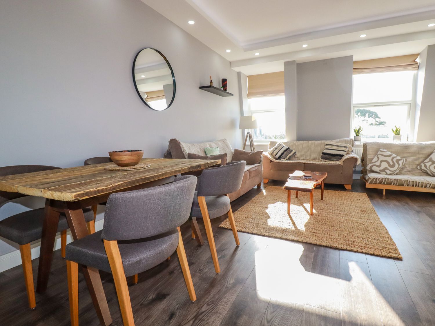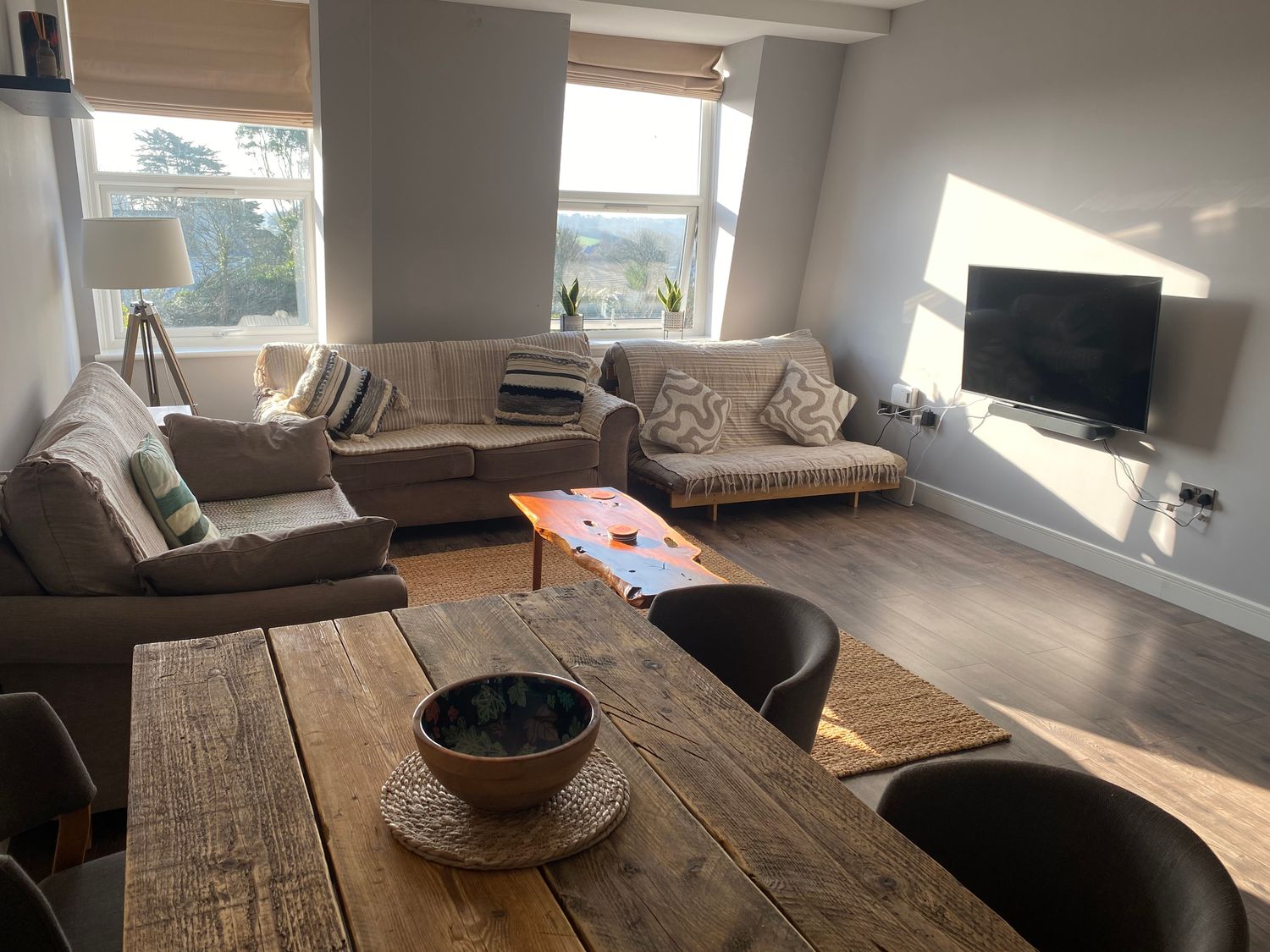 "Second-floor apartment. Two bedrooms: 1 x double with TV, 1 x twin. Bathroom with bath, shower over, basin, heated towel rail, WC. Open-plan living space with kitchen, dining area, and sitting area"