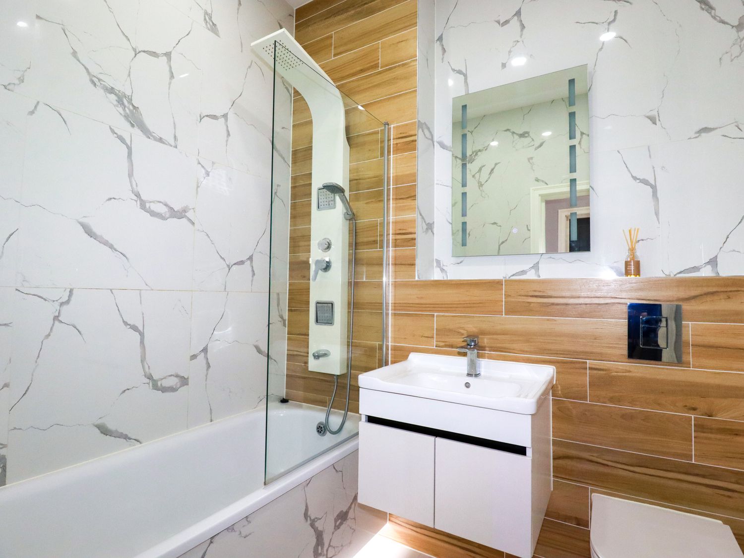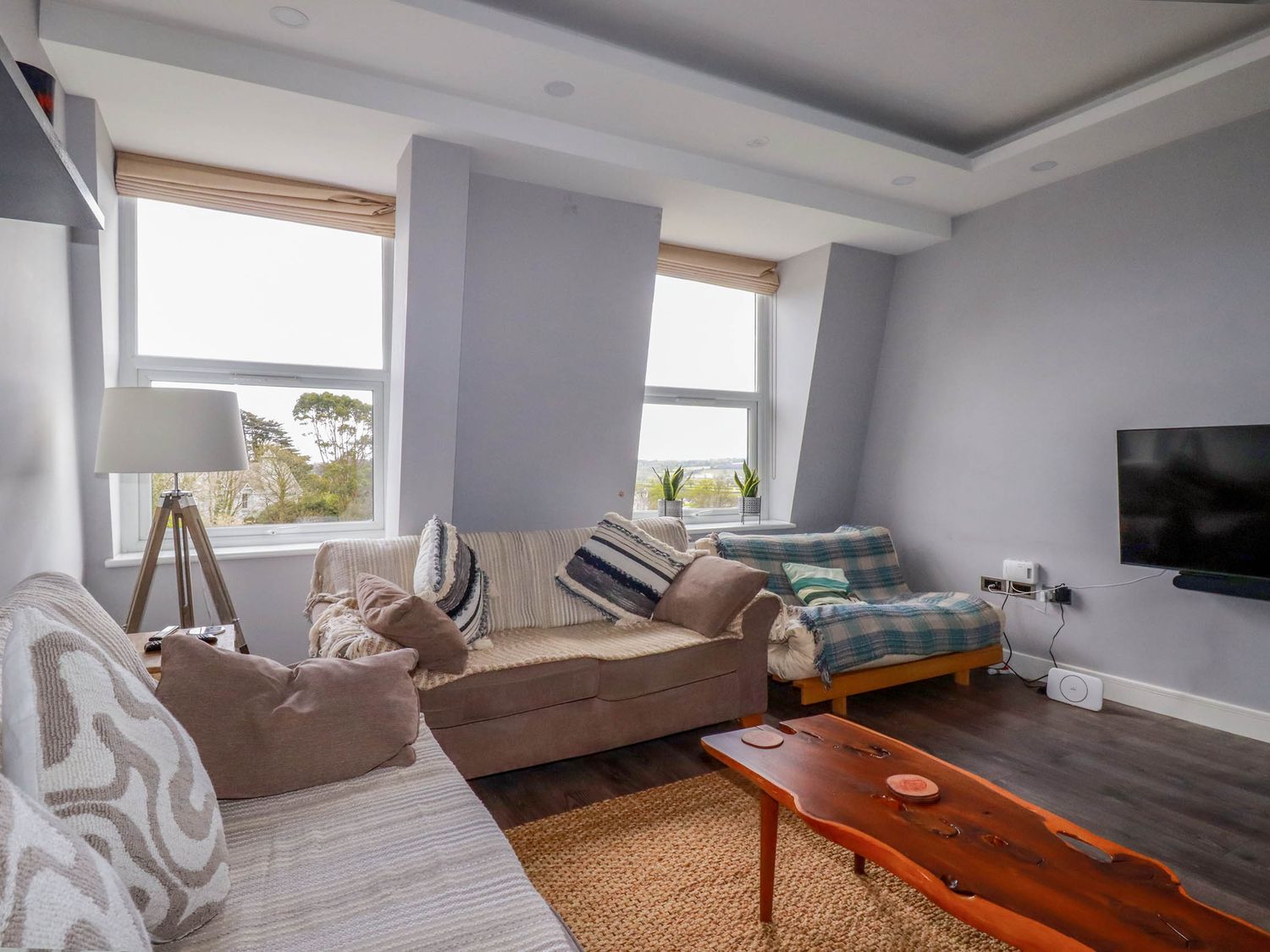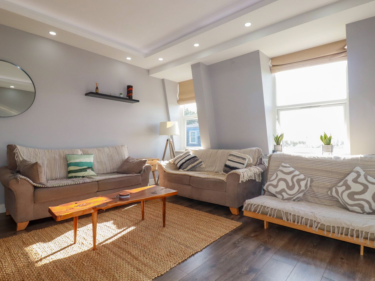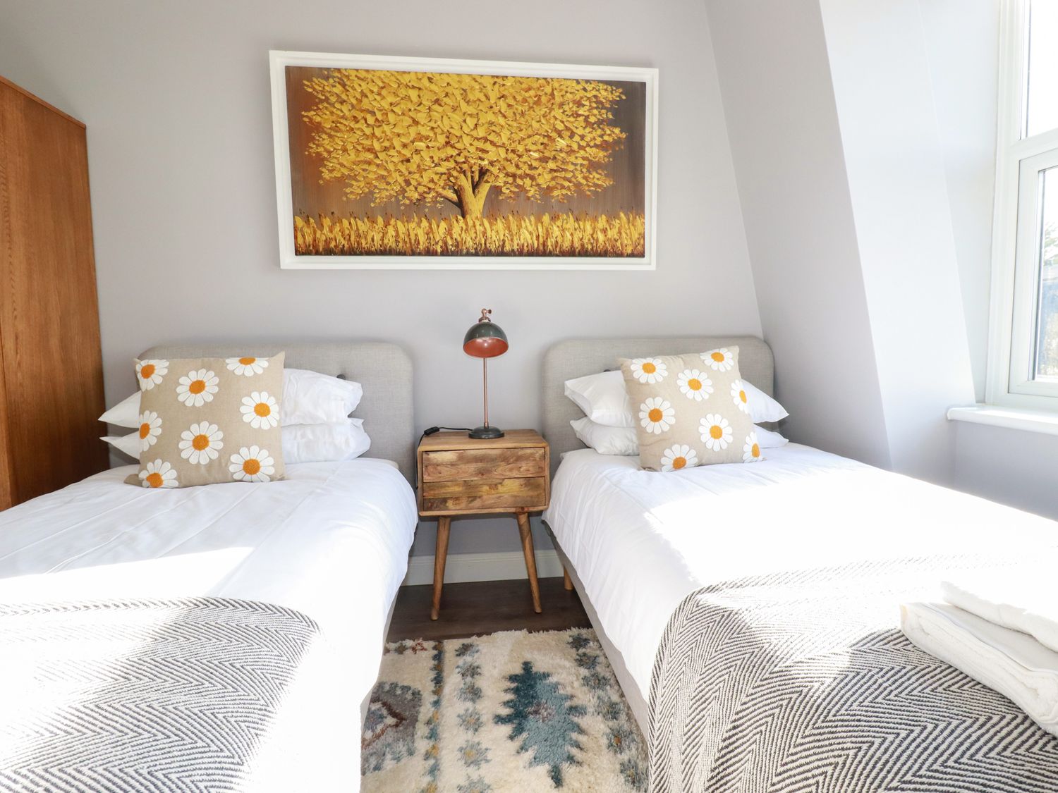 "Second-floor apartment. Two bedrooms: 1 x double with TV, 1 x twin. Bathroom with bath, shower over, basin, heated towel rail, WC. Open-plan living space with kitchen, dining area, and sitting area"