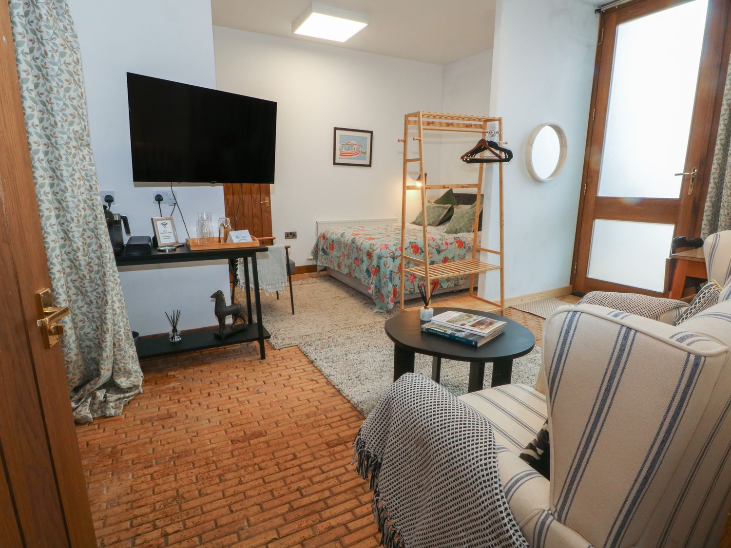 "First-floor apartment. Studio-style layout with double bed, dining area, and sitting area. Kitchen. Shower room with walk-in shower, basin and WC"
