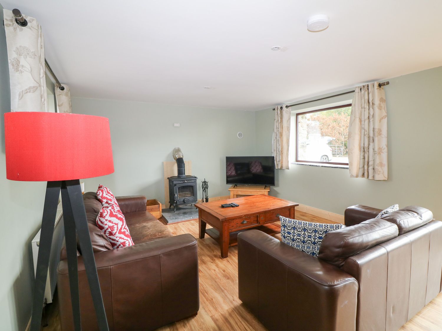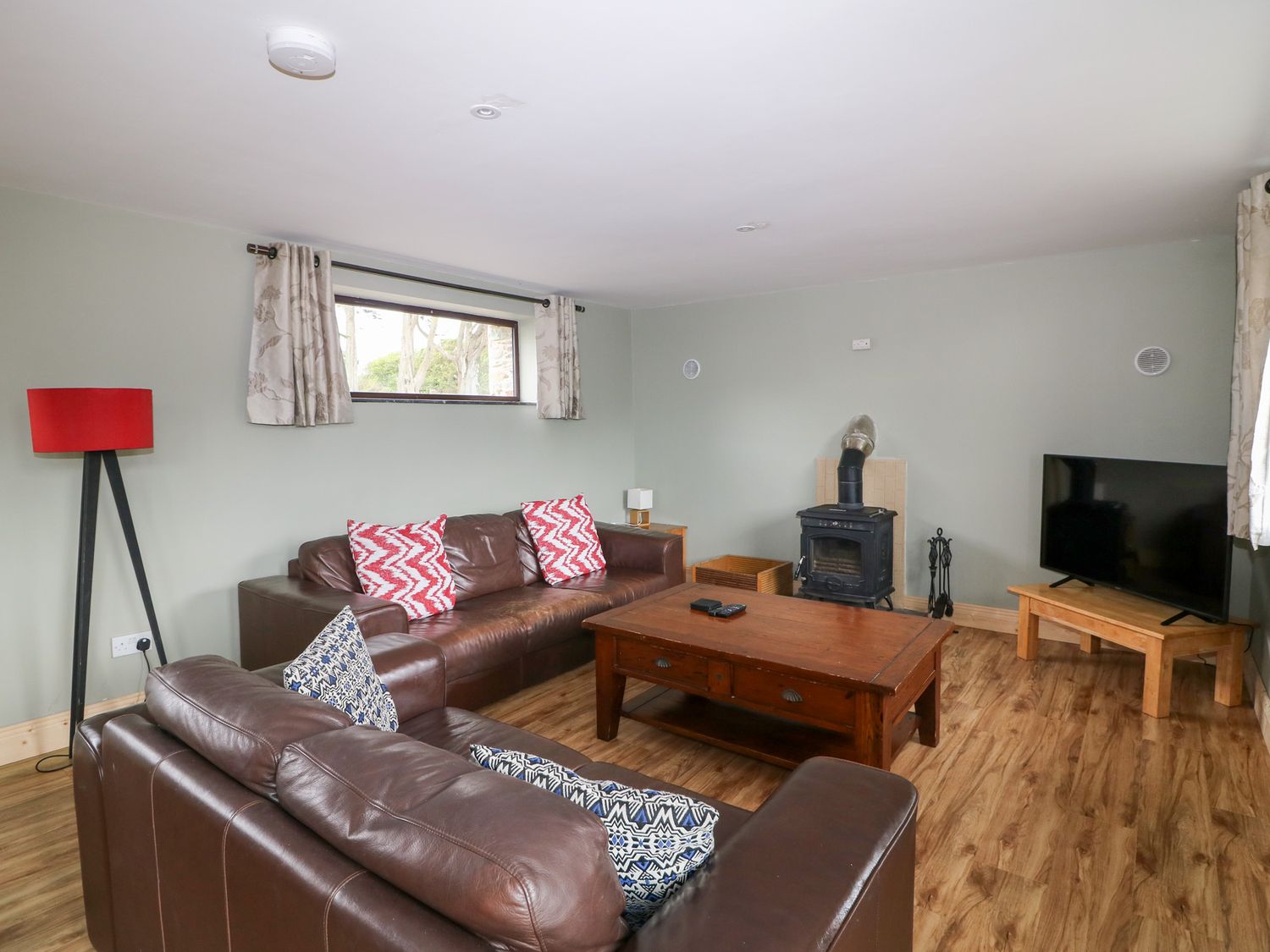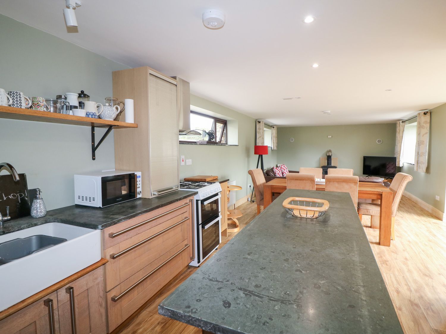 Open plan living area with kitchen, dining area, sitting area and woodburning stove."