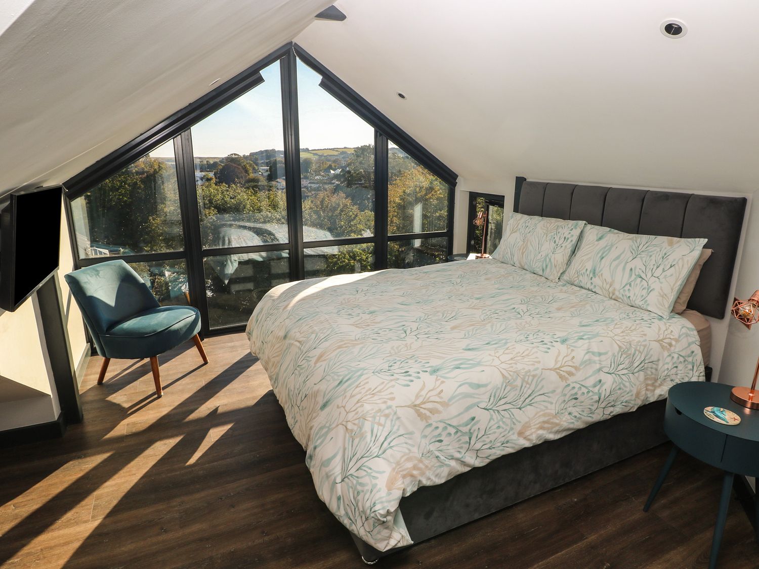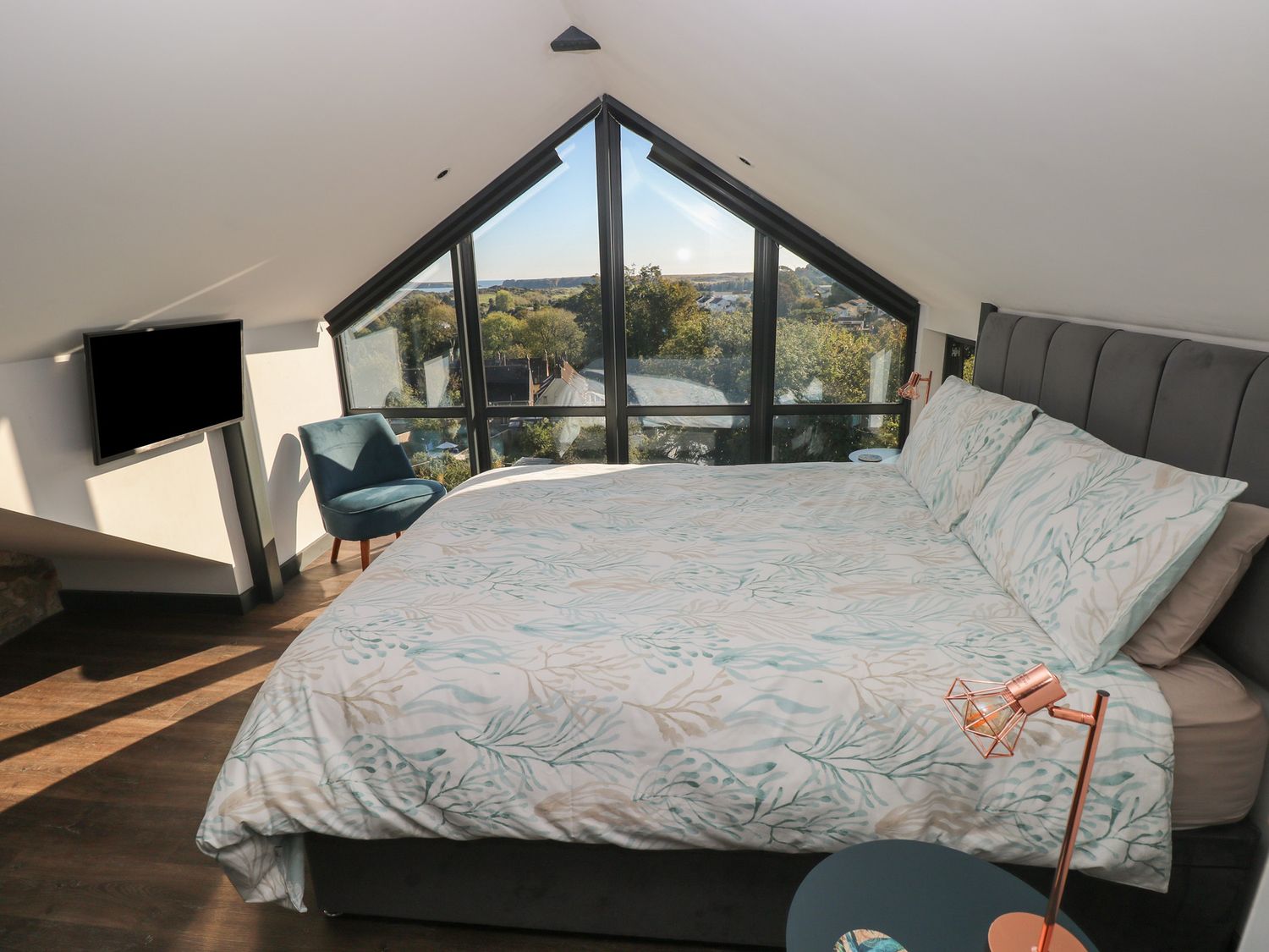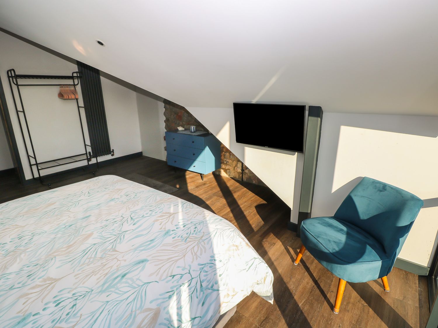 "Second-floor apartment. Two bedrooms: 1 x king-size with TV, exposed stonework, amazing views from window wall and en-suite with walk-in shower and basin and WC, 1 x twin with dormer window. Bathroom with bath, hand held shower, basin, WC. Open-plan living space with kitchen/diner and sitting area"