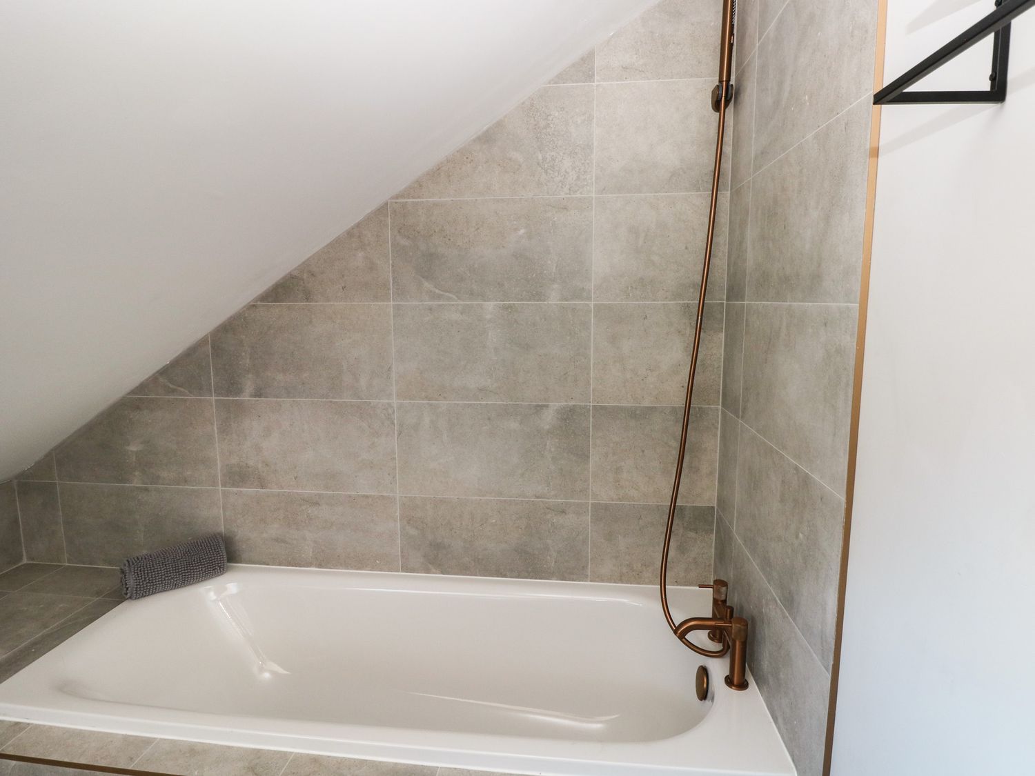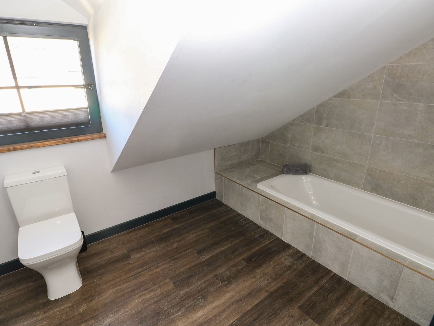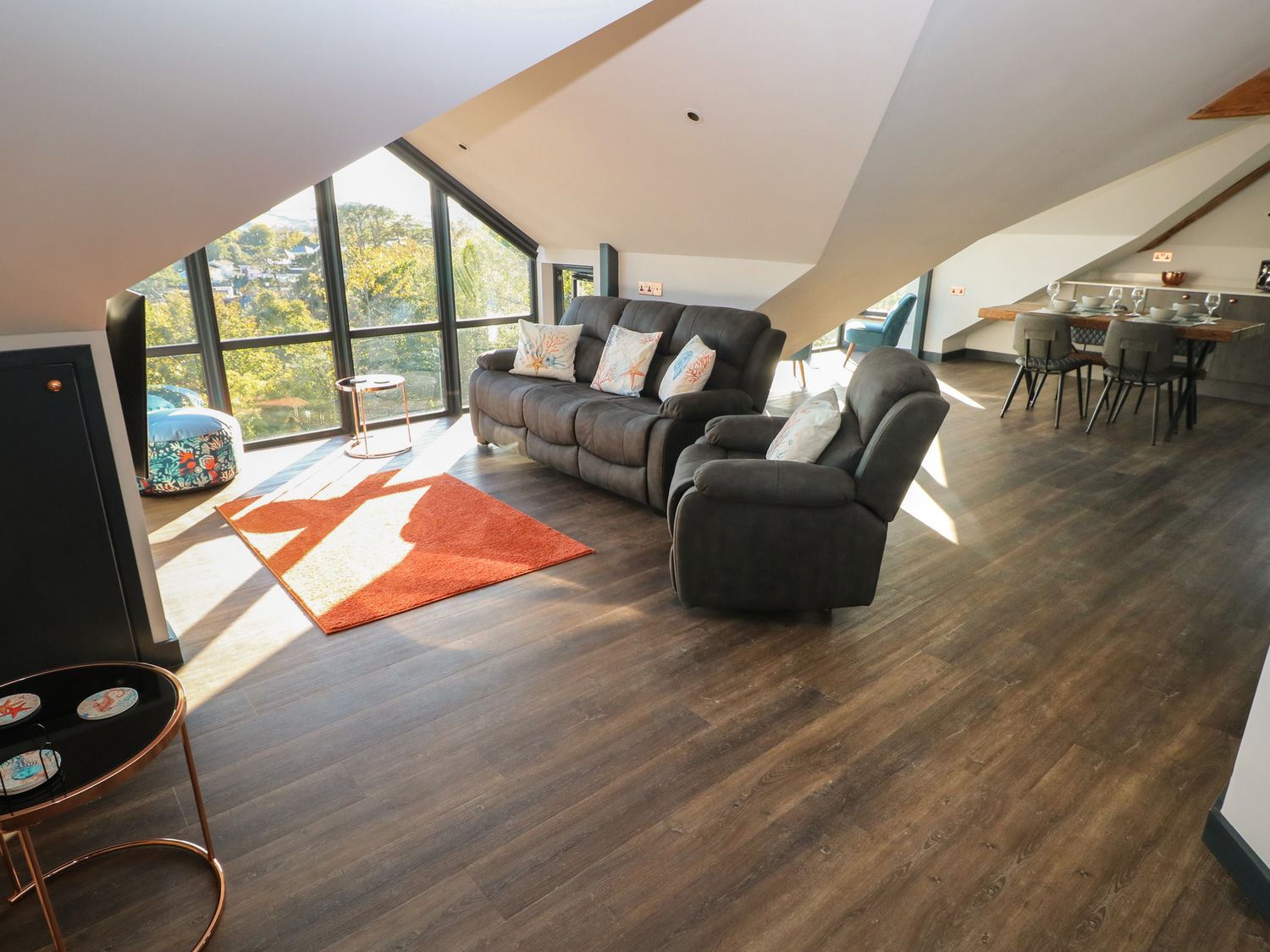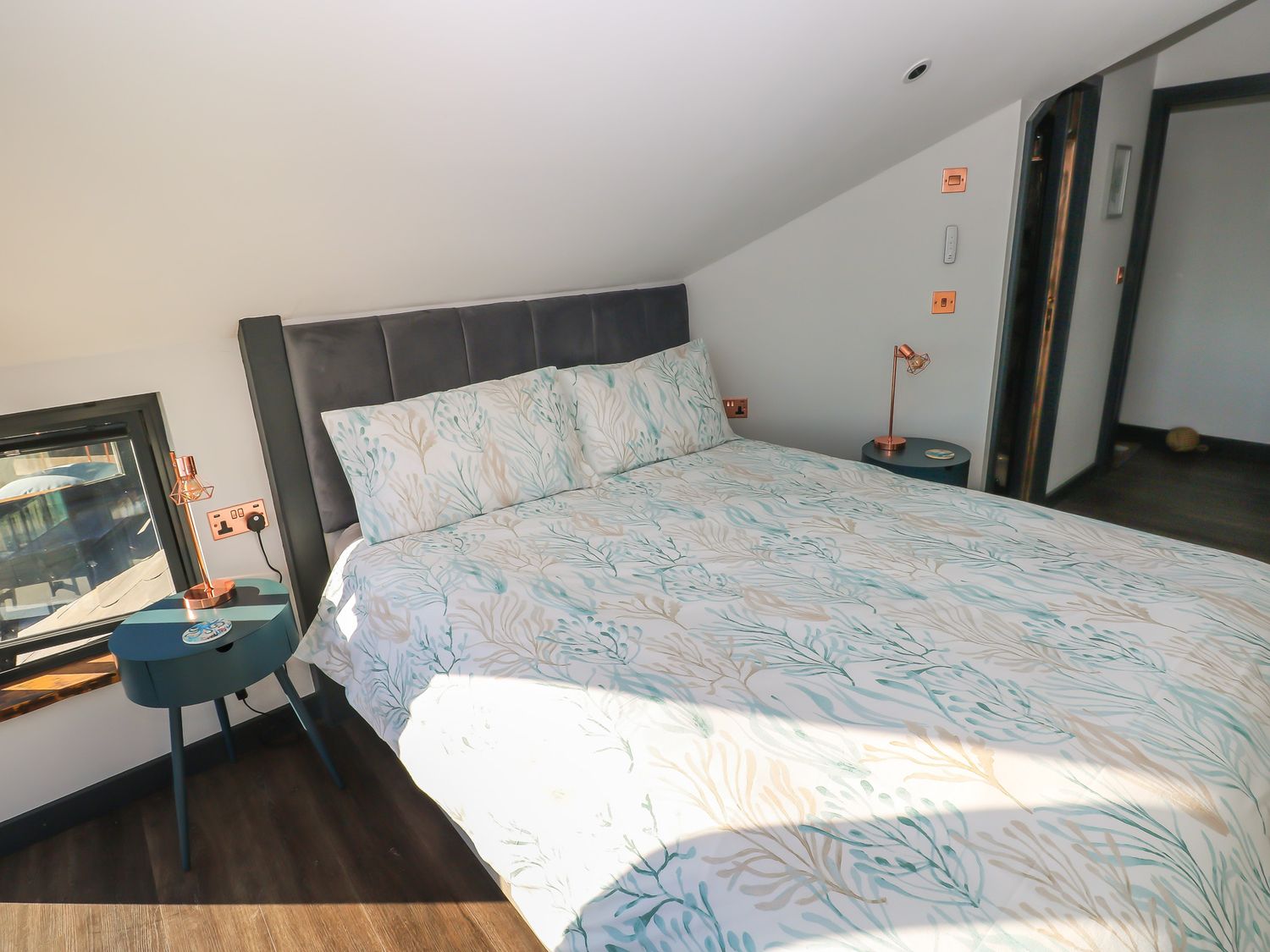 "Second-floor apartment. Two bedrooms: 1 x king-size with TV, exposed stonework, amazing views from window wall and en-suite with walk-in shower and basin and WC, 1 x twin with dormer window. Bathroom with bath, hand held shower, basin, WC. Open-plan living space with kitchen/diner and sitting area"