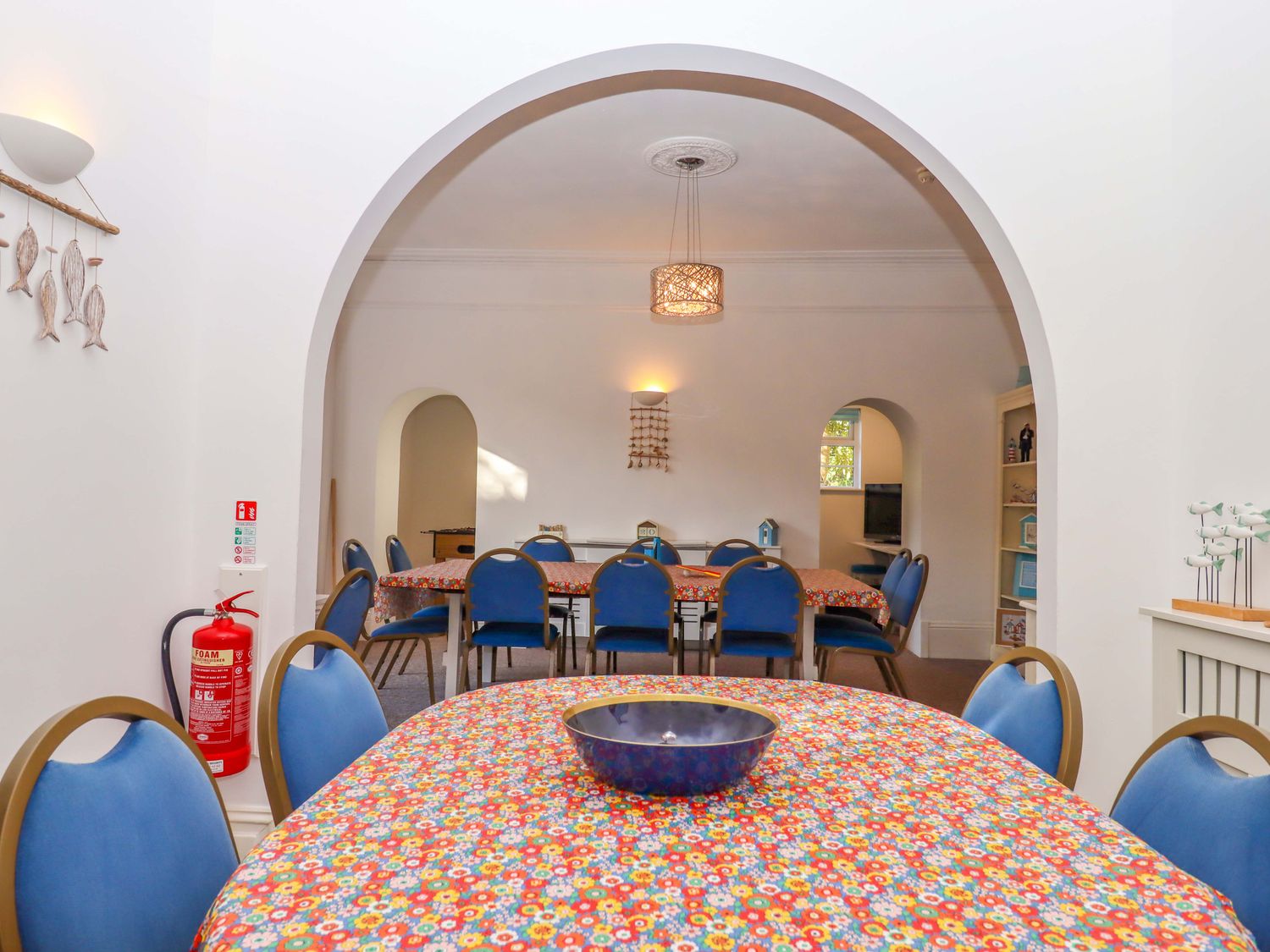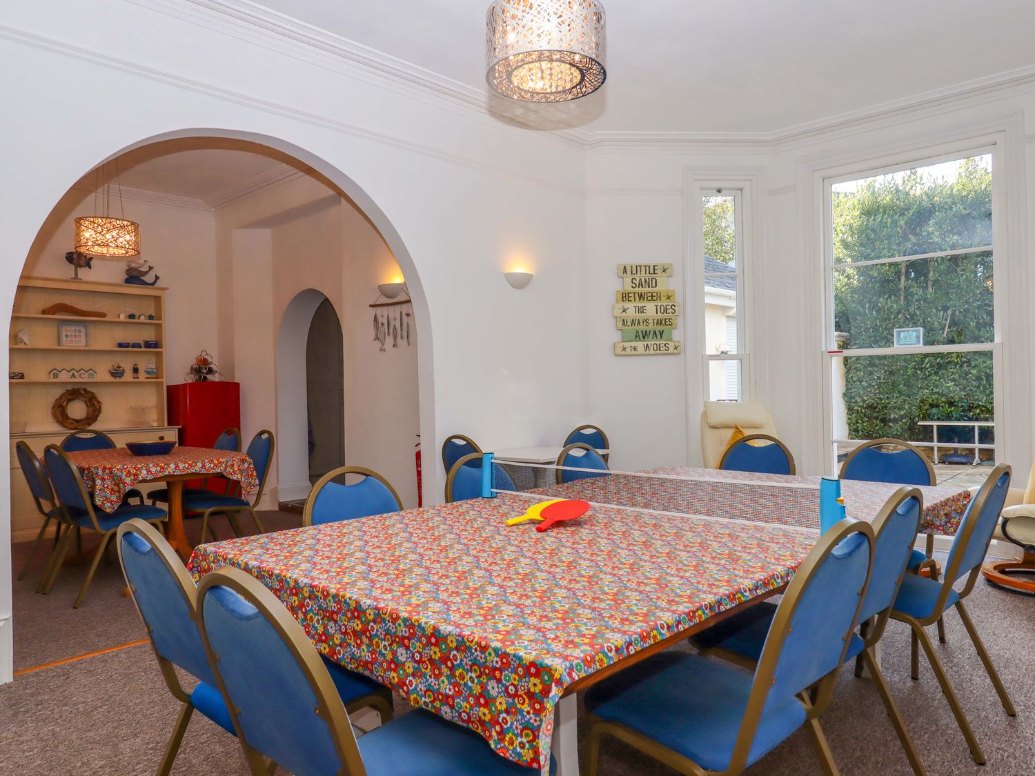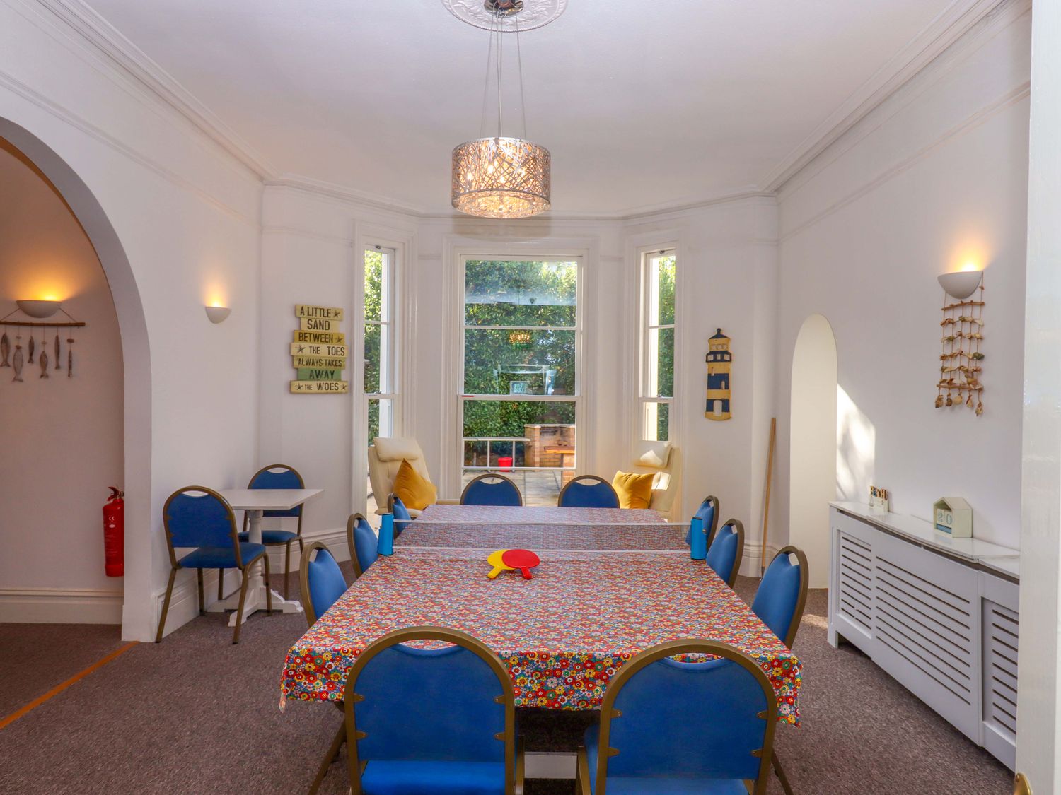 "Babbacombe Hall is a detached Victorian Villa resting in Babbacombe. The house can sleep 16 people in eight double or twin bedrooms each with its own ensuite. A comfortable sitting room, formal dining room and games room complete the accommodation. Outside you'll find a neat lawned garden and patio and ample parking. Perfect for fun family gatherings and get togethers, Babbacombe Hall is exceptional. Electric cars must not be charged at this property."