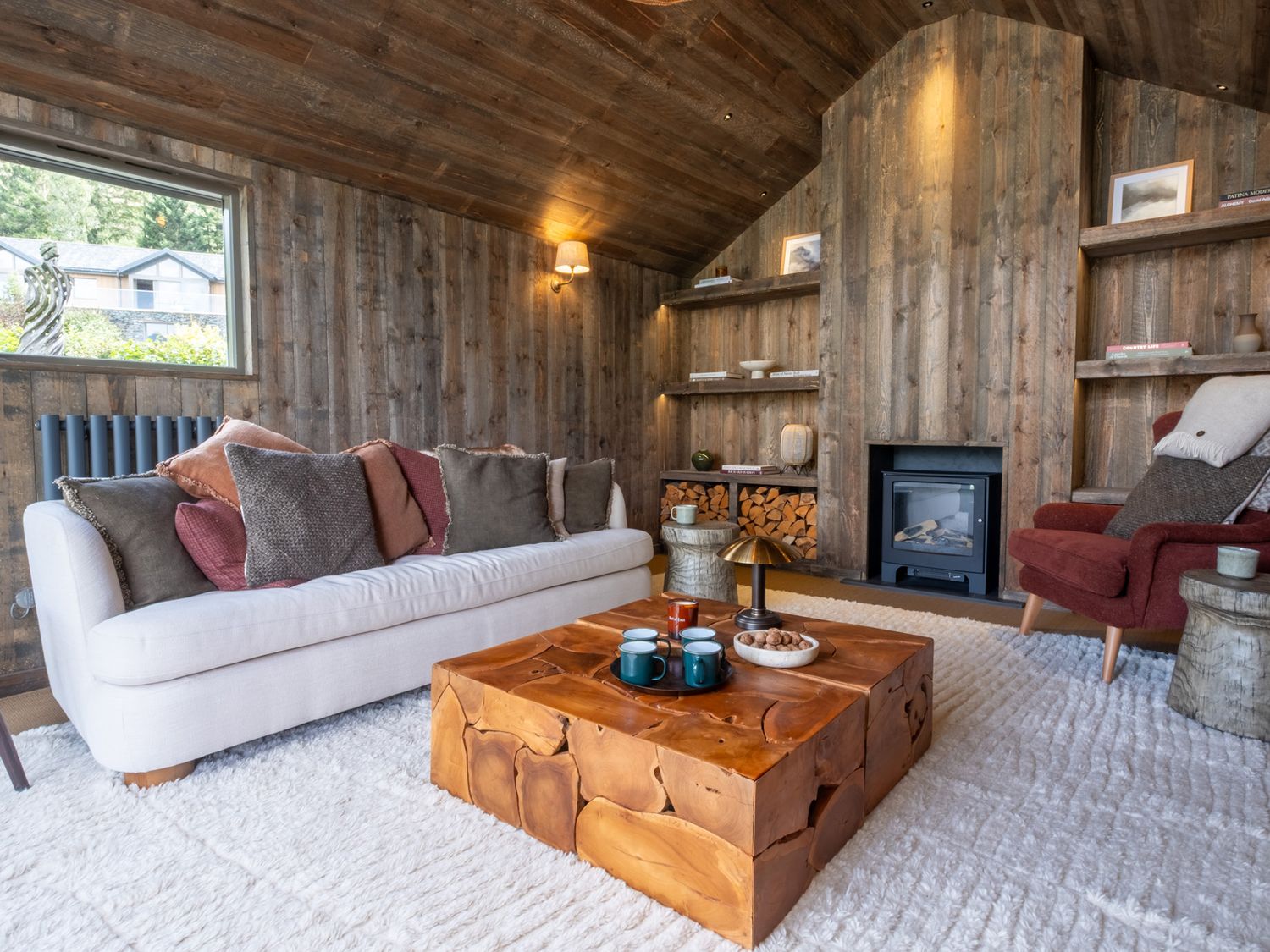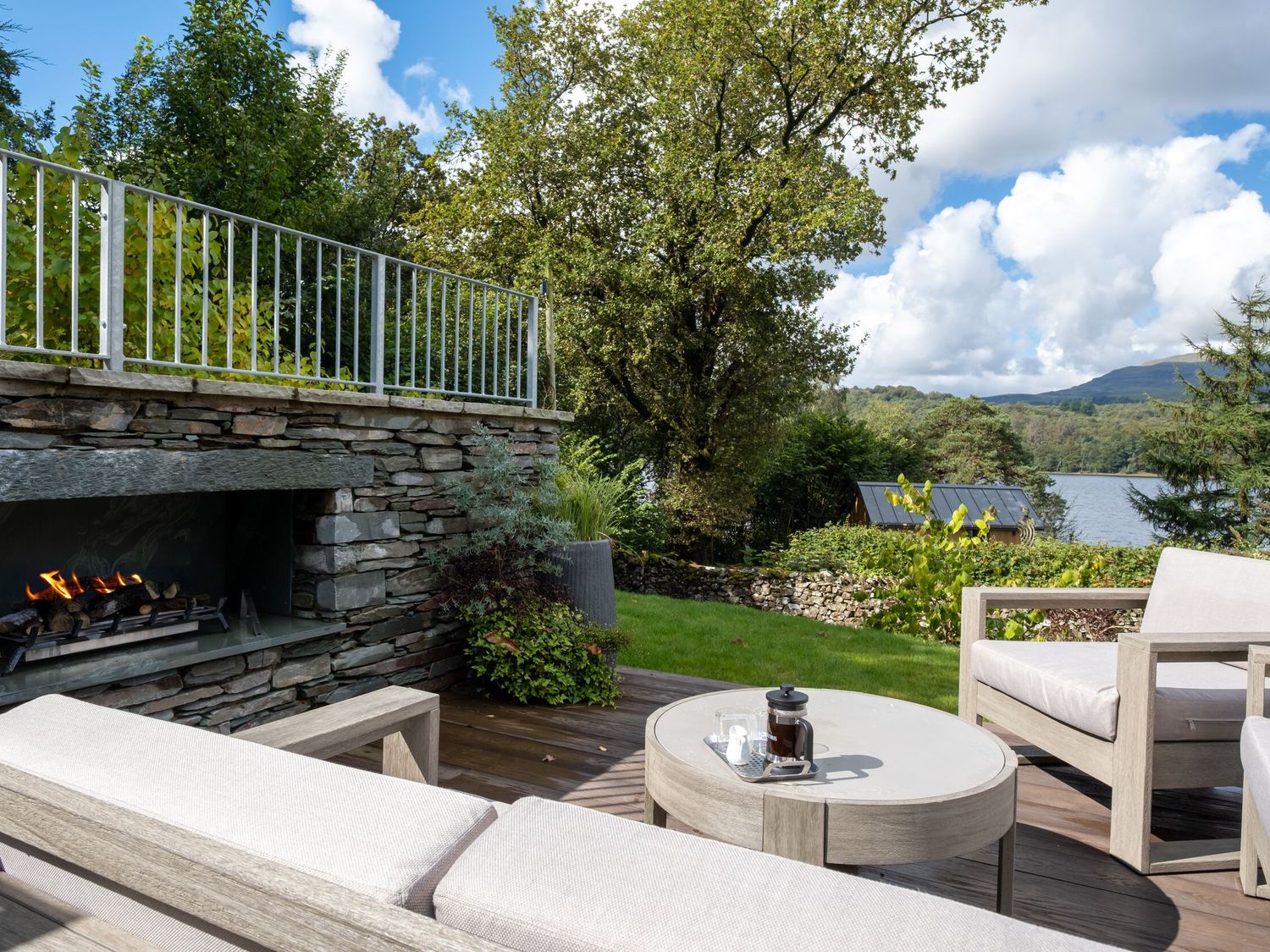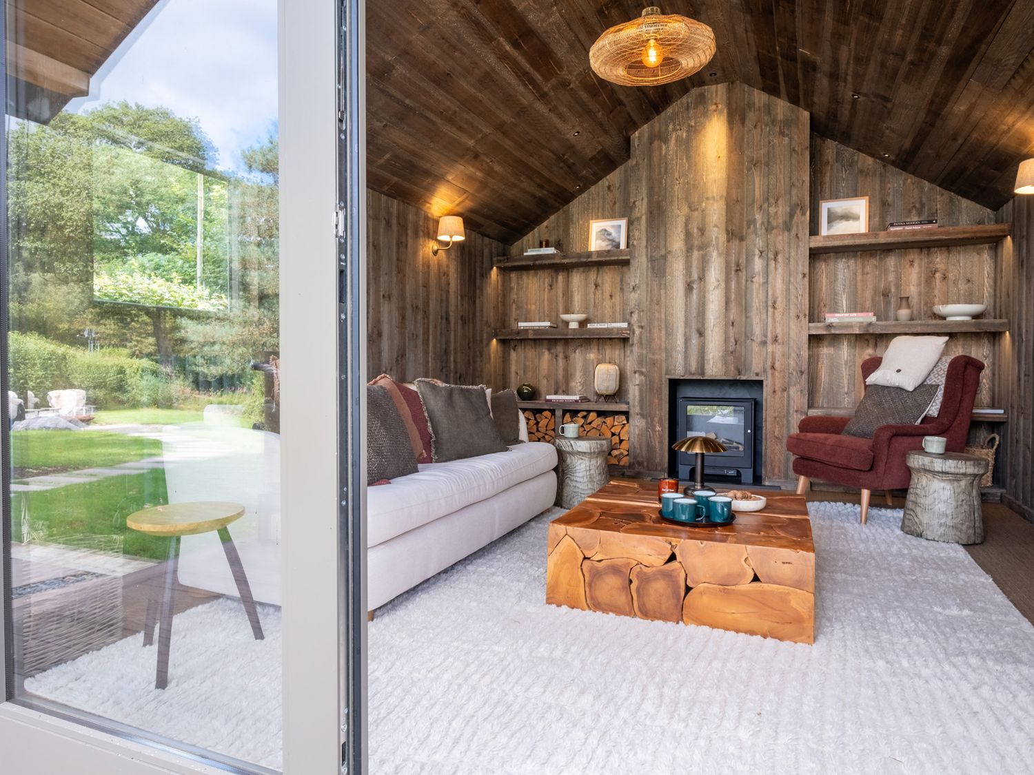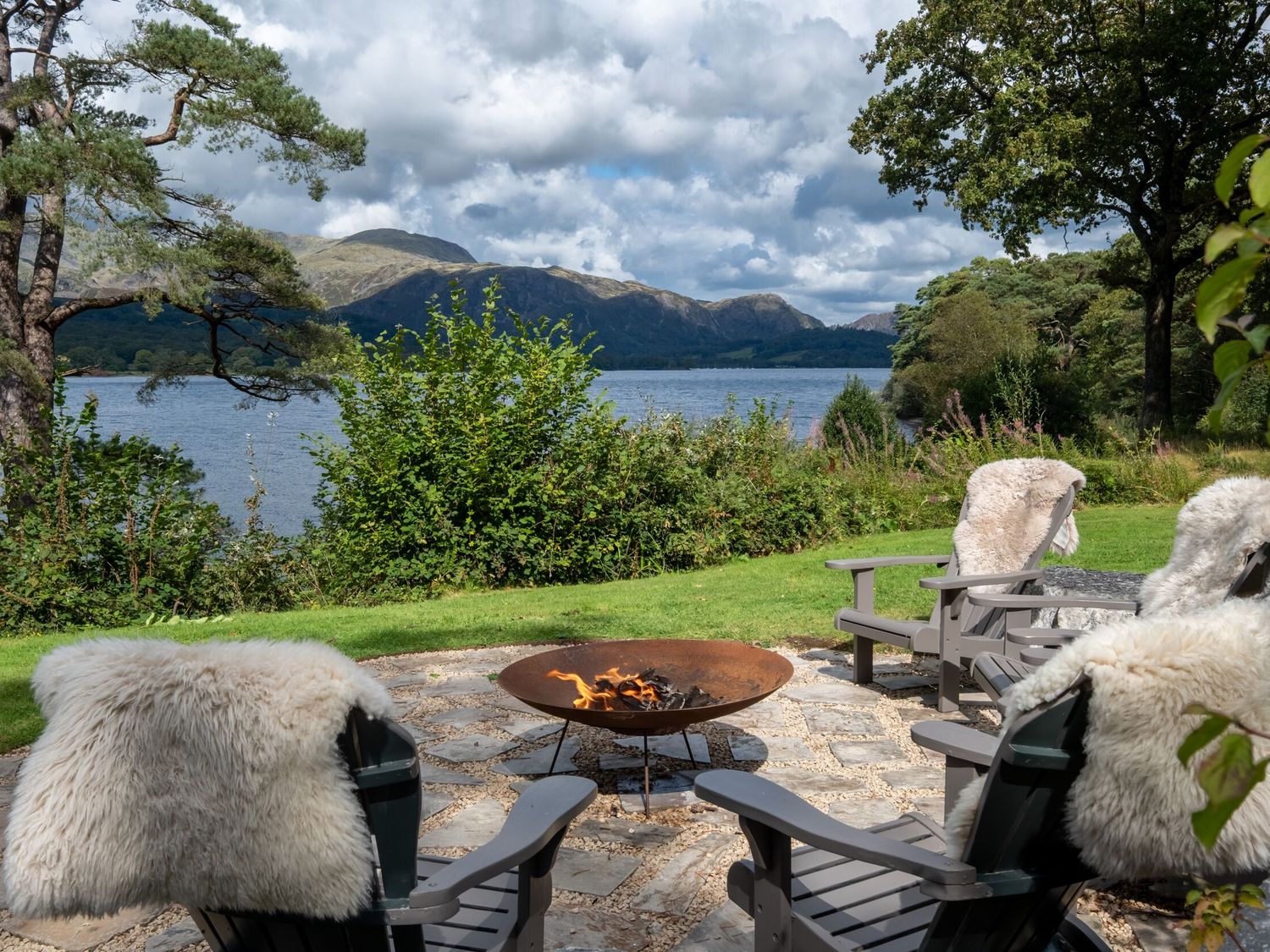 Lakeside boathouse snug fully furnished with electric log effect stove, path to patio with outdoor furniture with fire pit.