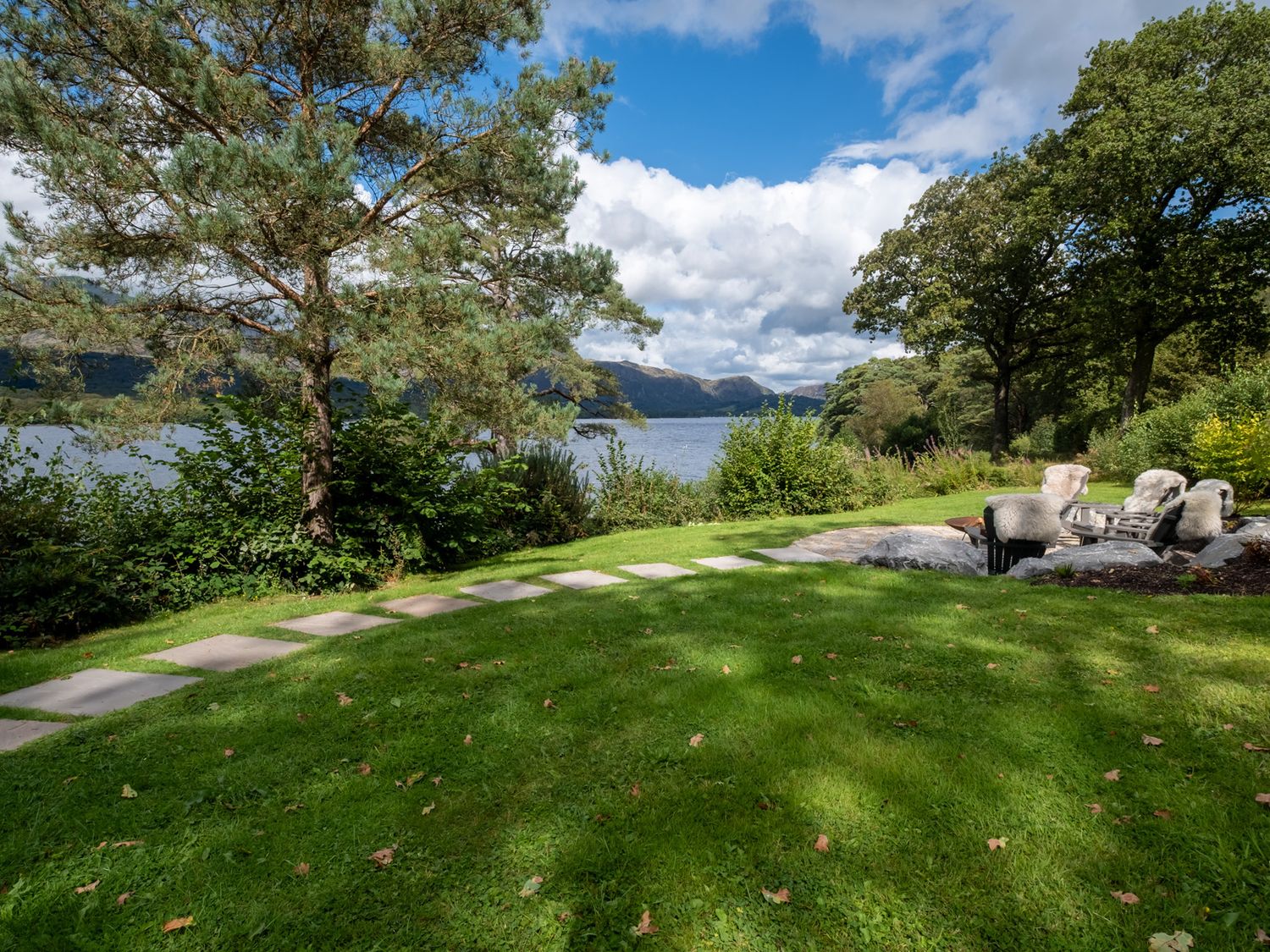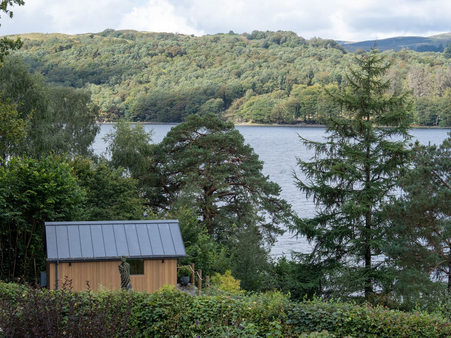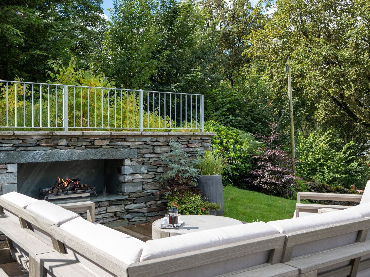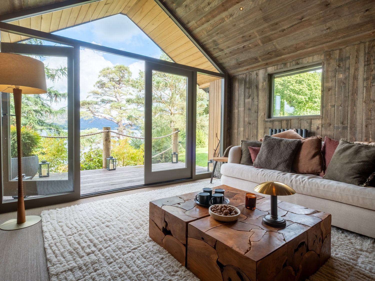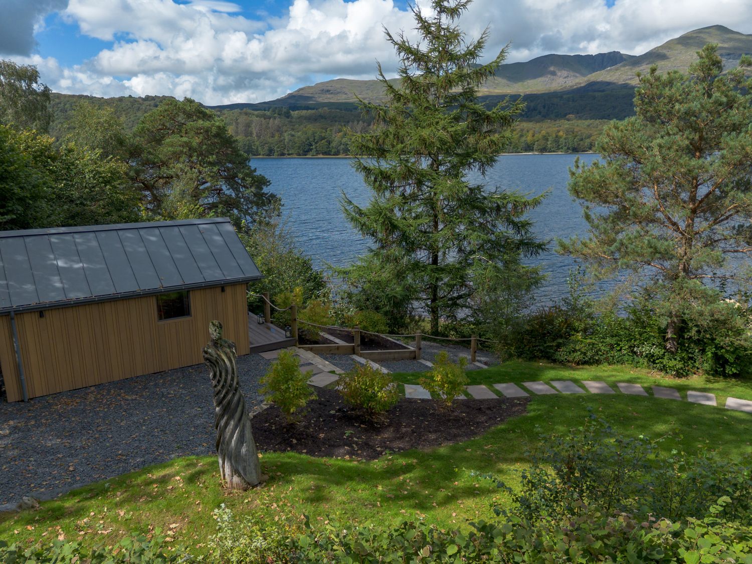 Lakeside boathouse snug fully furnished with electric log effect stove, path to patio with outdoor furniture with fire pit.