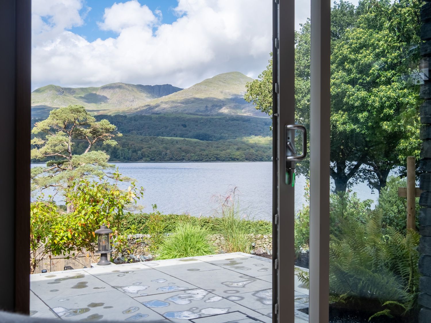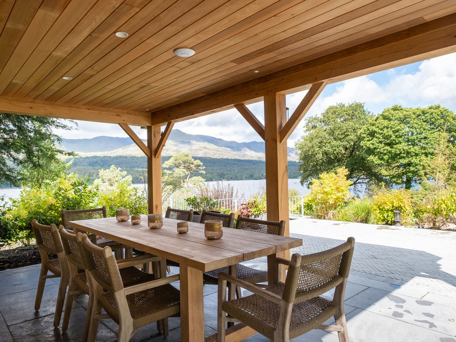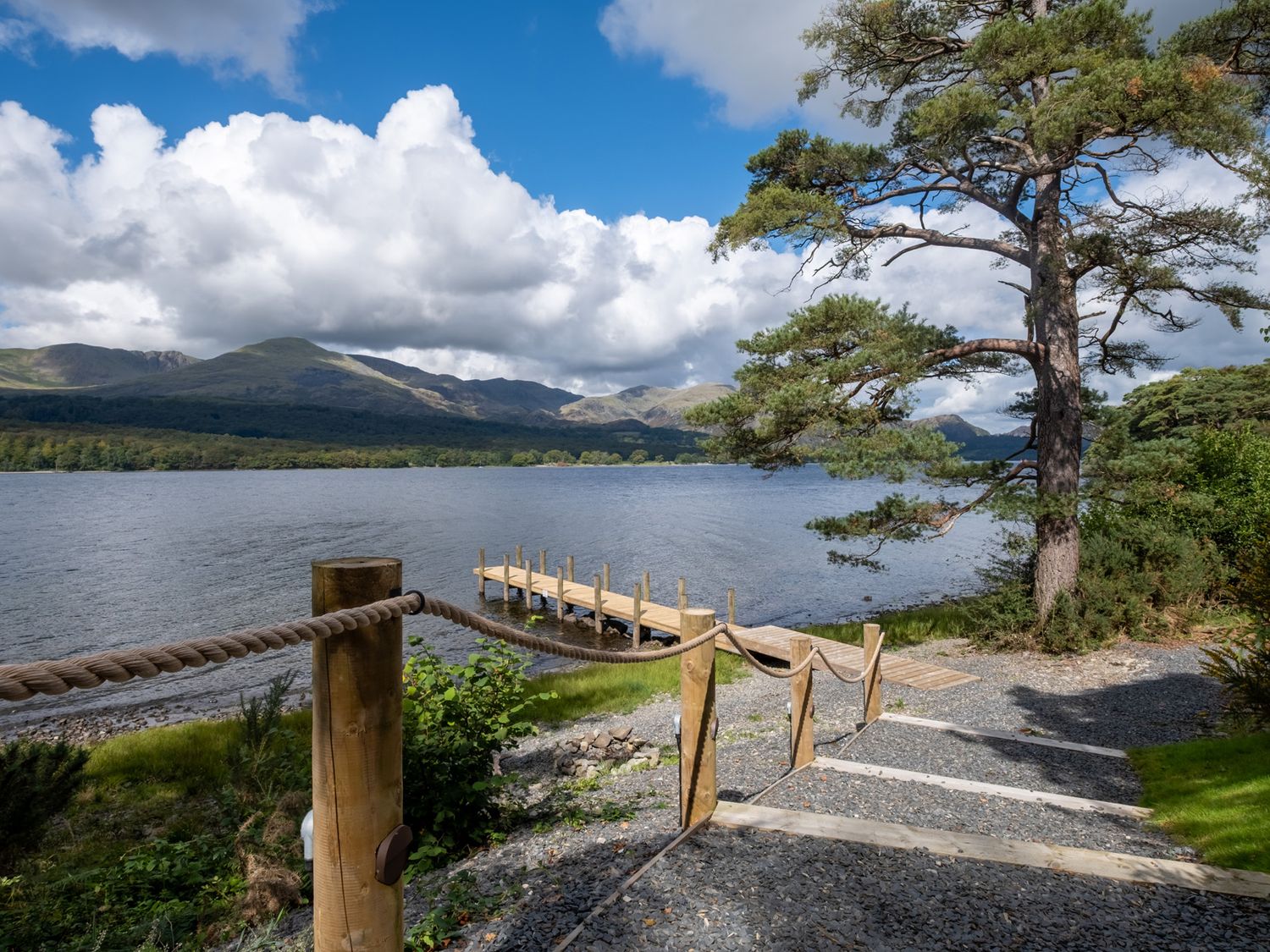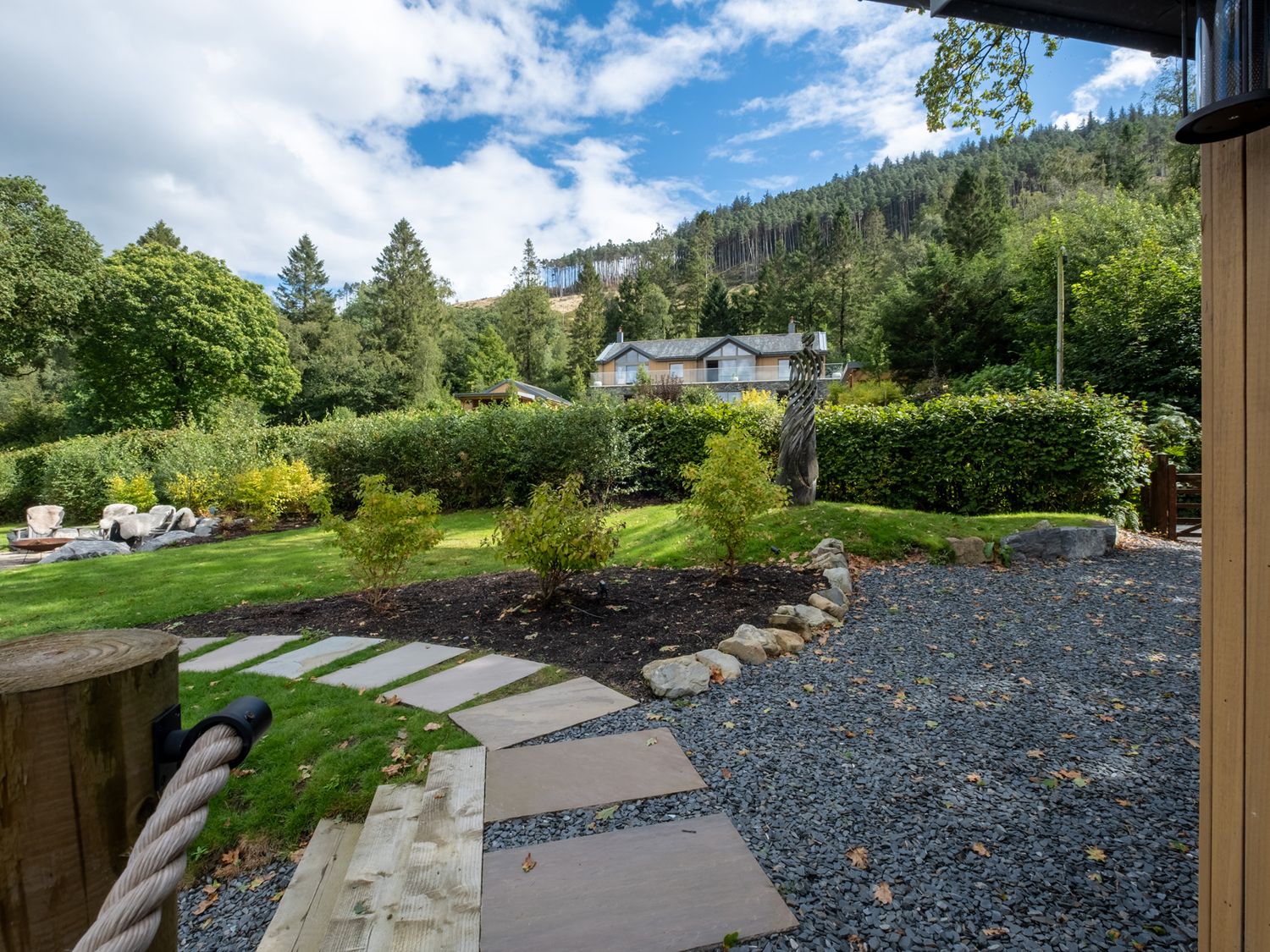 Lakeside boathouse snug fully furnished with electric log effect stove, path to patio with outdoor furniture with fire pit.