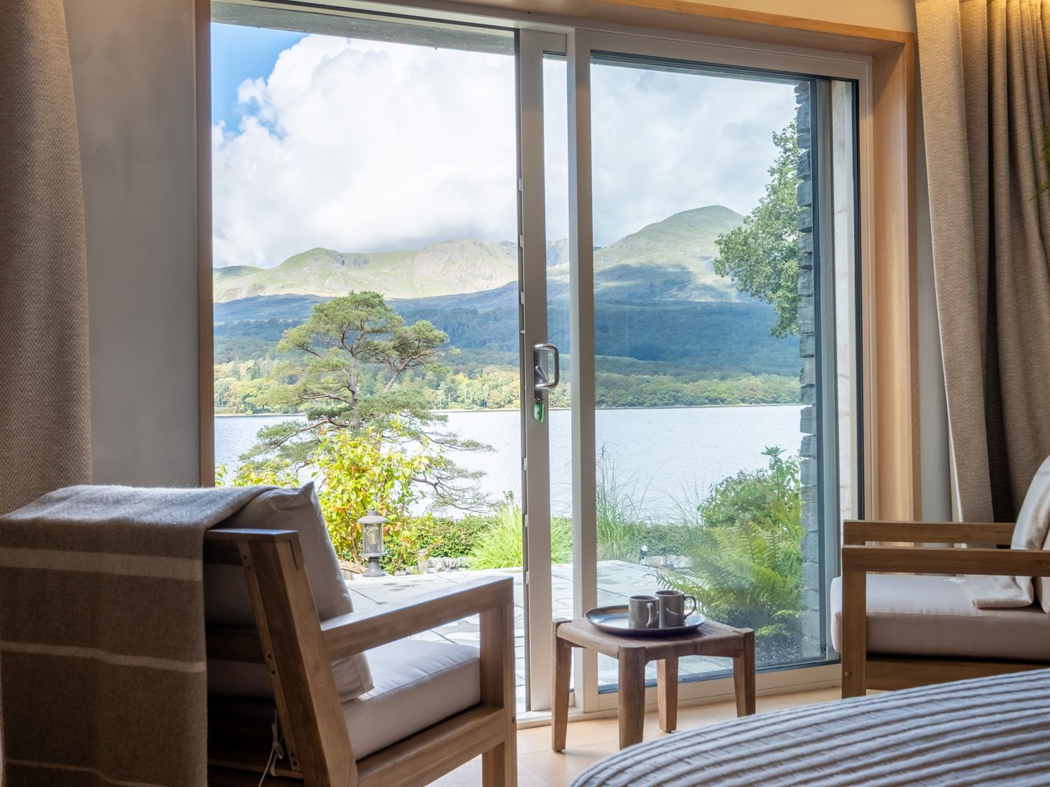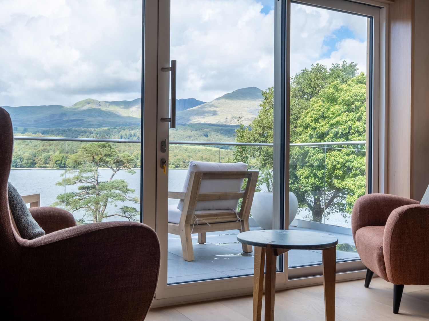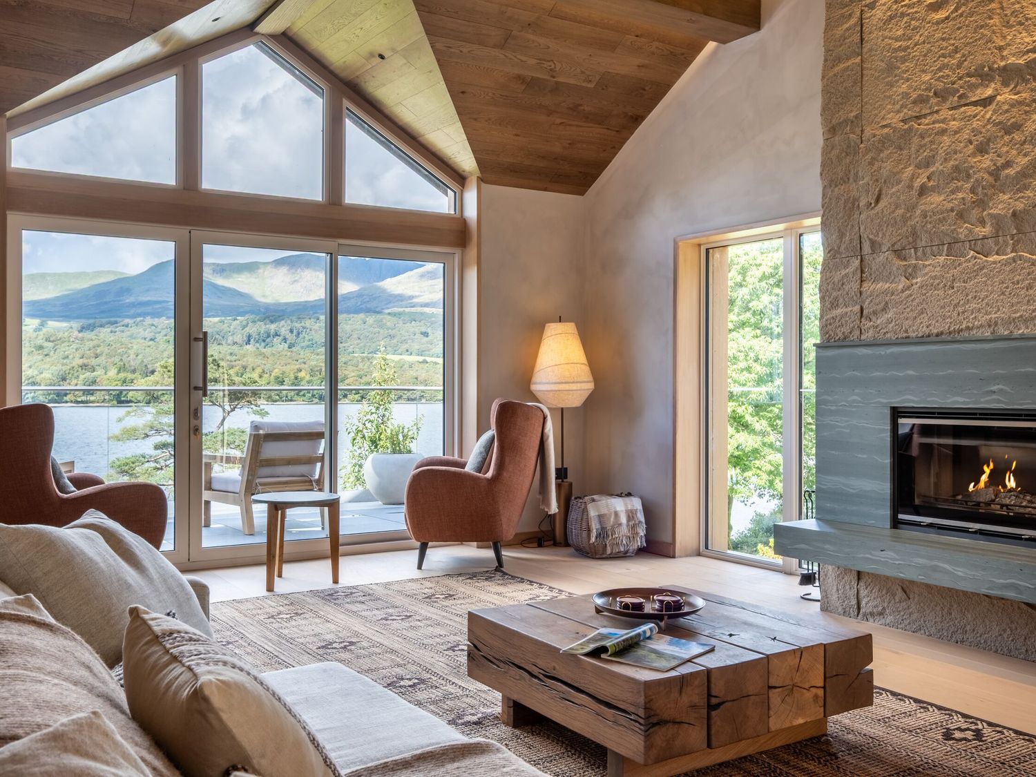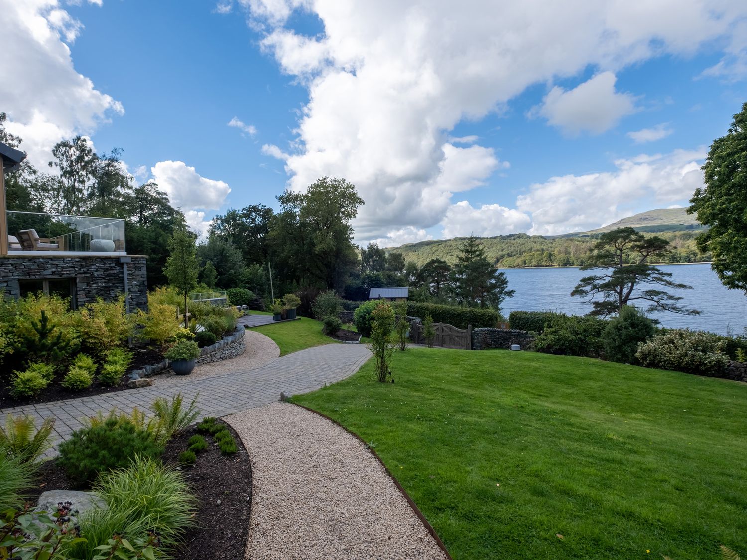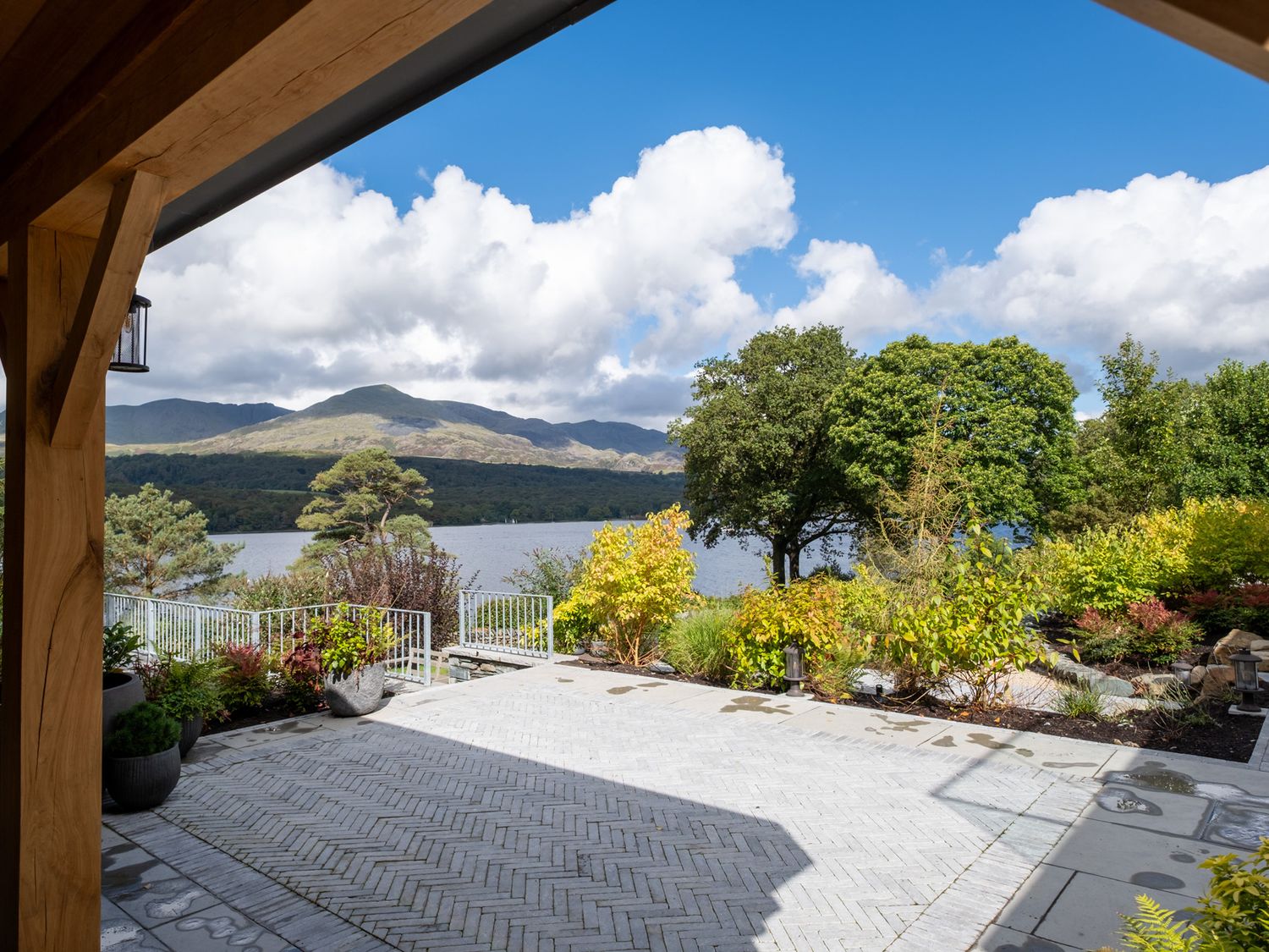 Lakeside boathouse snug fully furnished with electric log effect stove, path to patio with outdoor furniture with fire pit.