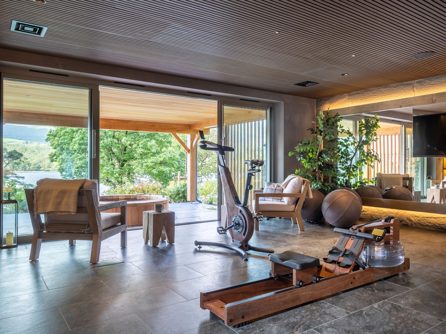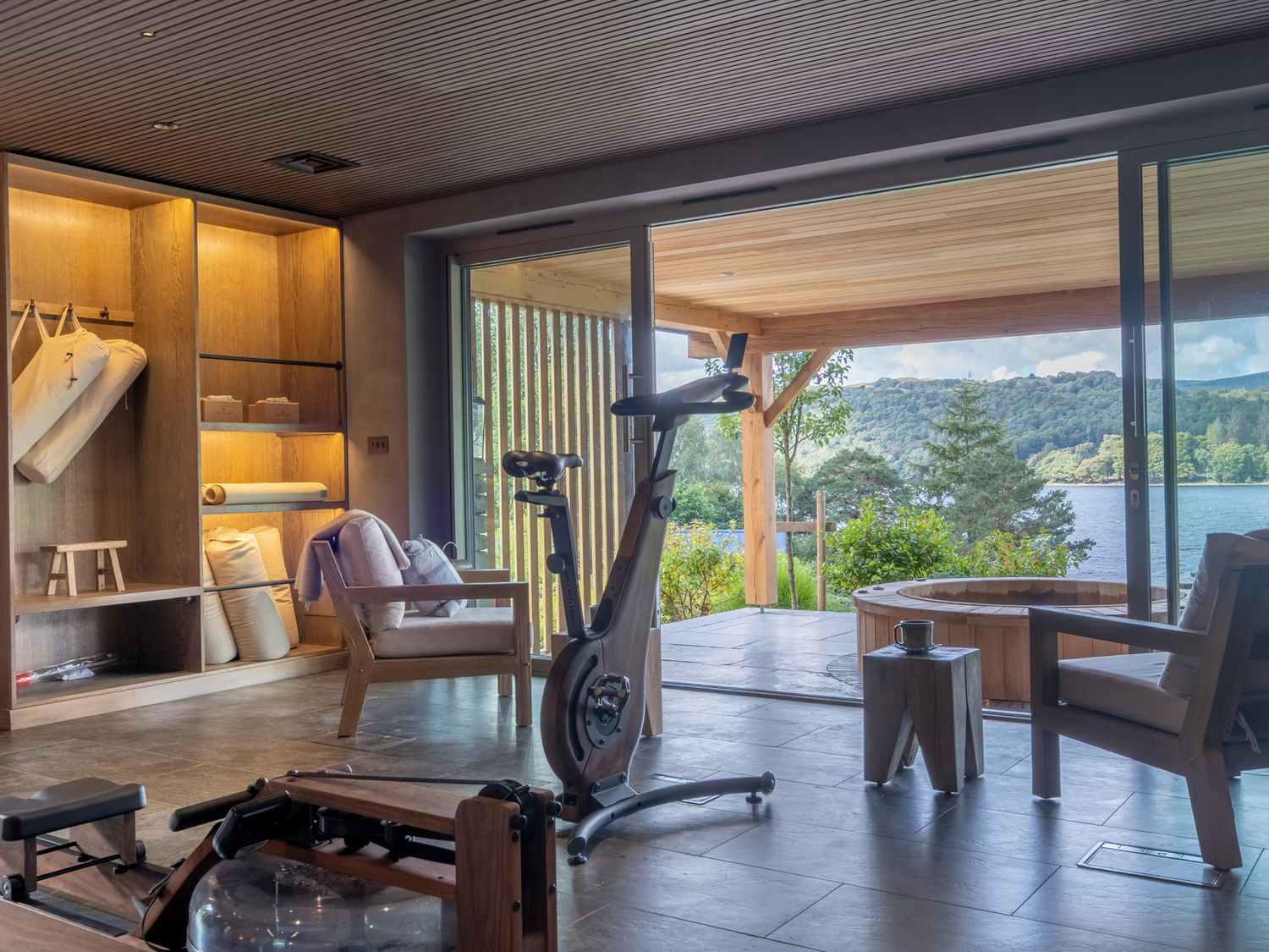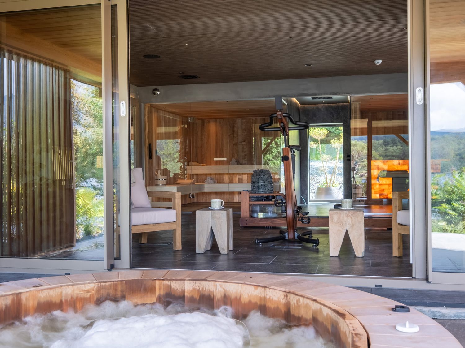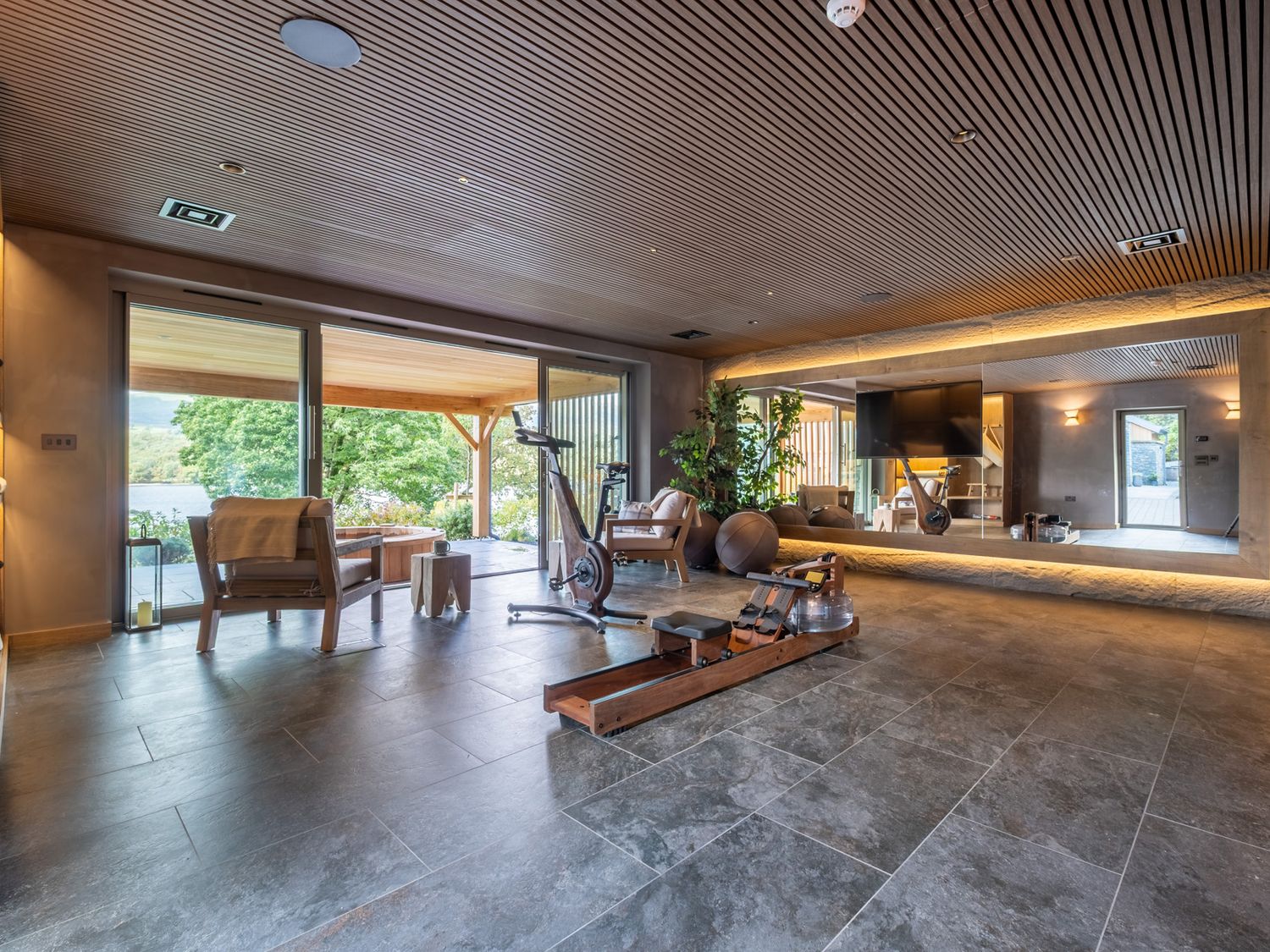 Wellness suite with gym including rowing machine, exercise bike, yoga mats, balls and weights, TV, sauna, Himalayan salt treatment room and shower room with rainforest shower, basin. Branded robes to use when at the property. Undercover hot tub.