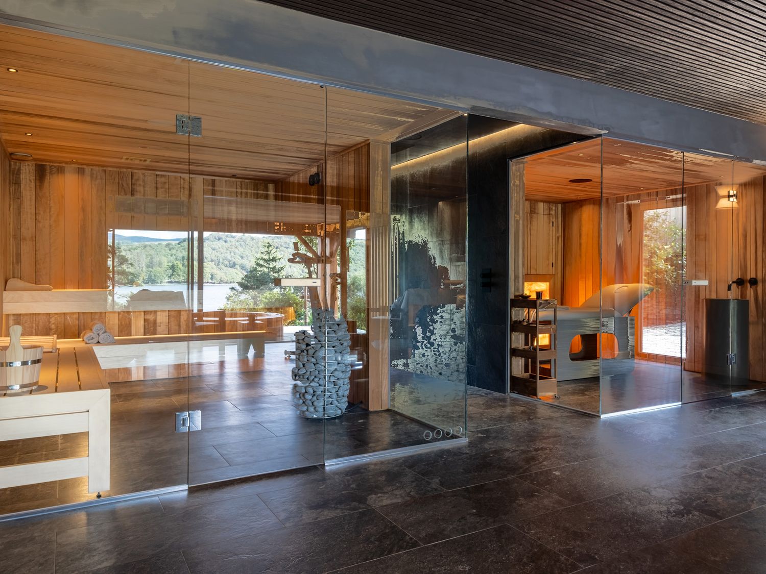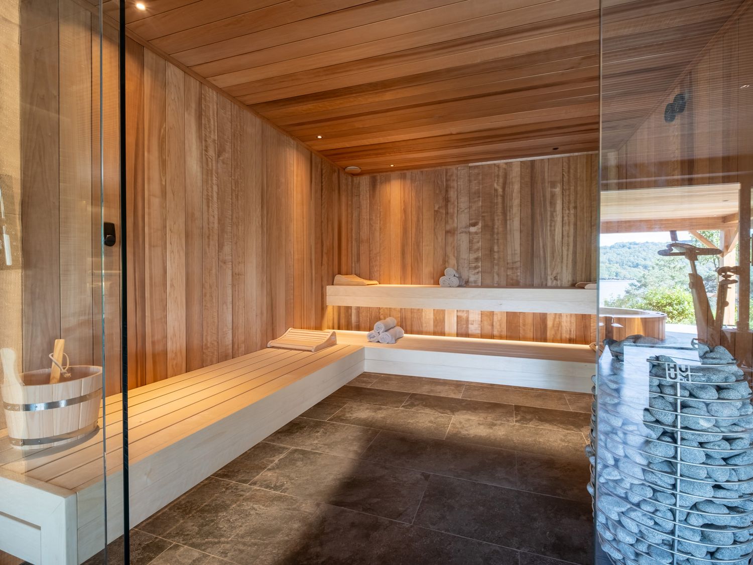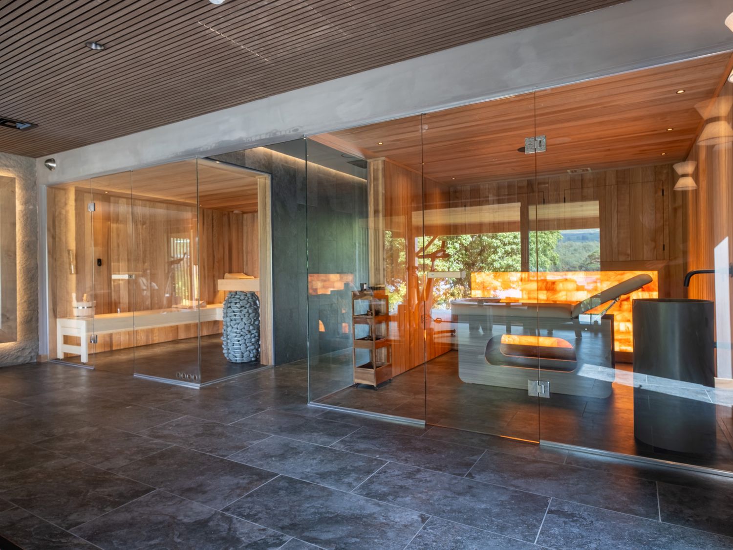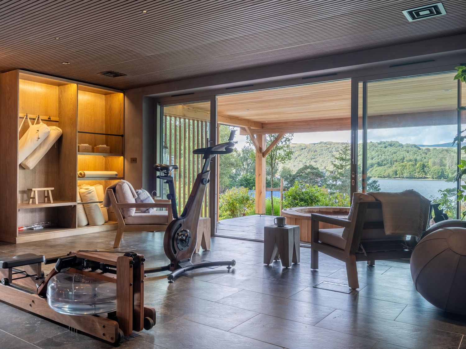 Wellness suite with gym including rowing machine, exercise bike, yoga mats, balls and weights, TV, sauna, Himalayan salt treatment room and shower room with rainforest shower, basin. Branded robes to use when at the property. Undercover hot tub.