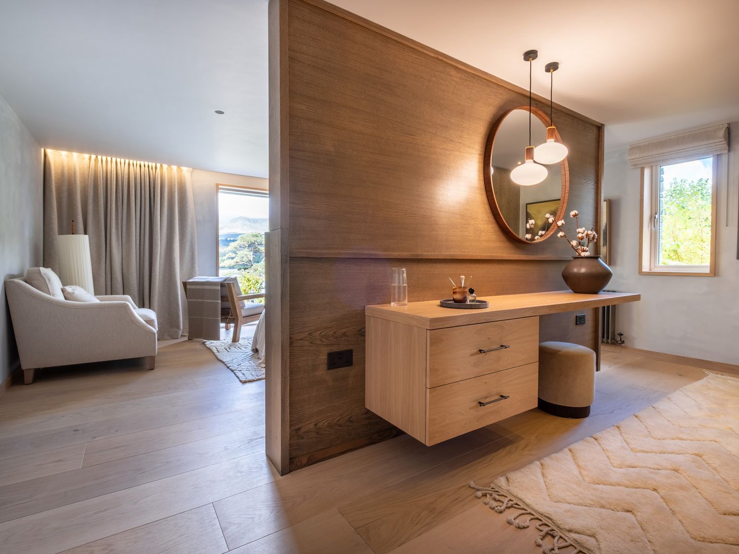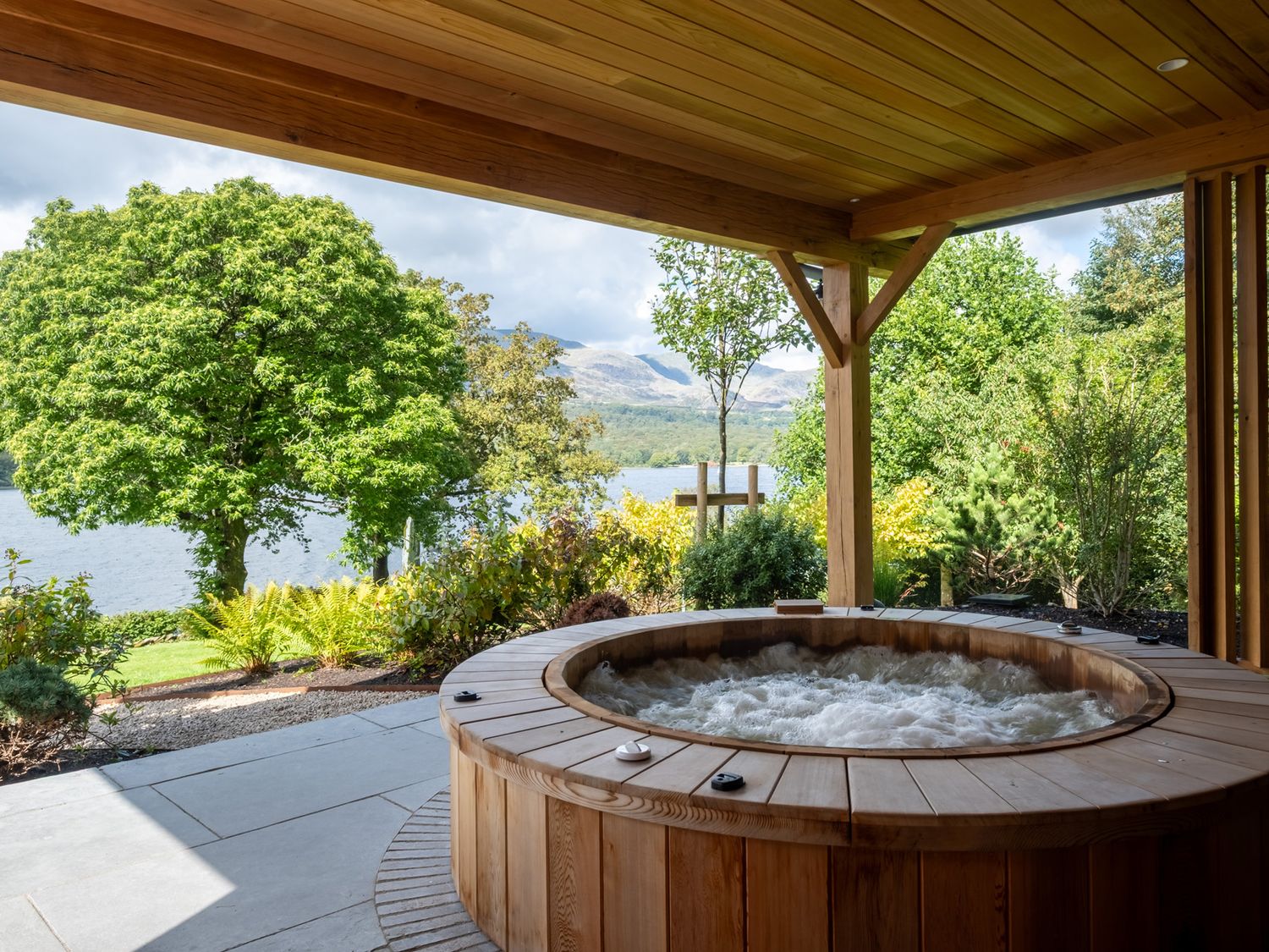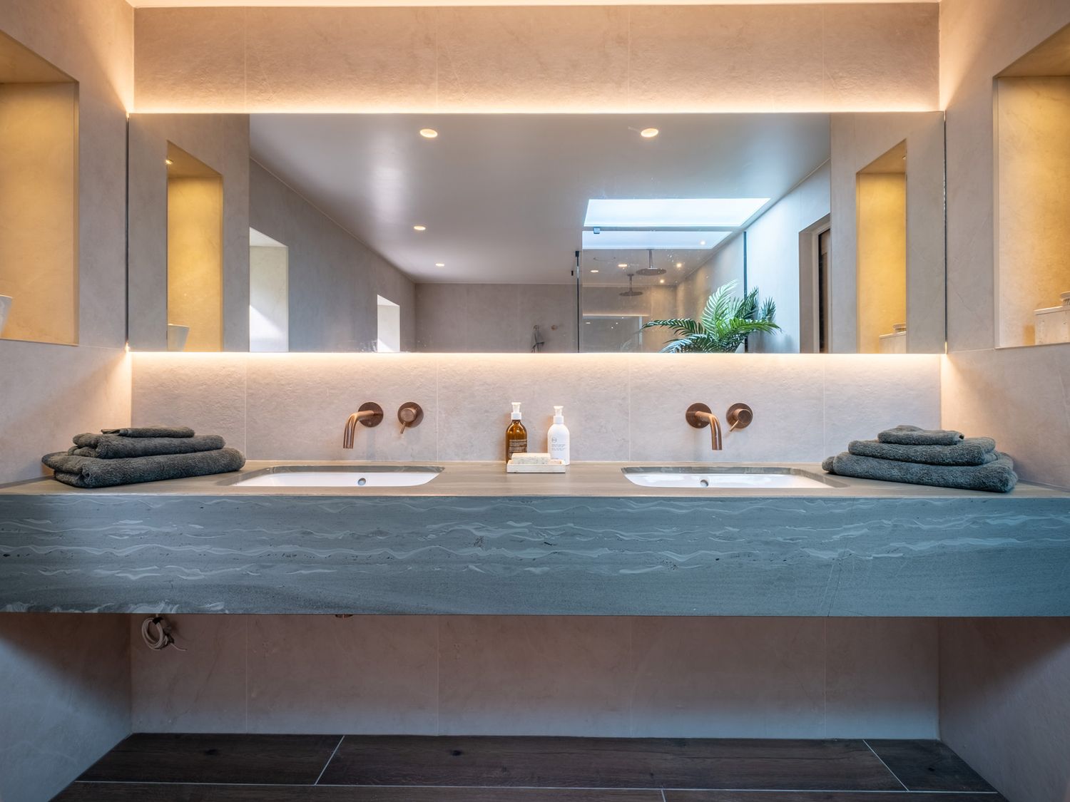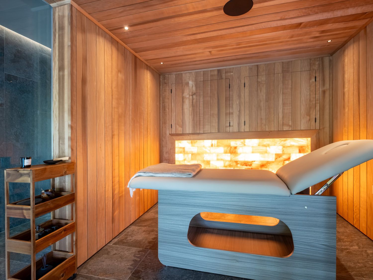 Wellness suite with gym including rowing machine, exercise bike, yoga mats, balls and weights, TV, sauna, Himalayan salt treatment room and shower room with rainforest shower, basin. Branded robes to use when at the property. Undercover hot tub.