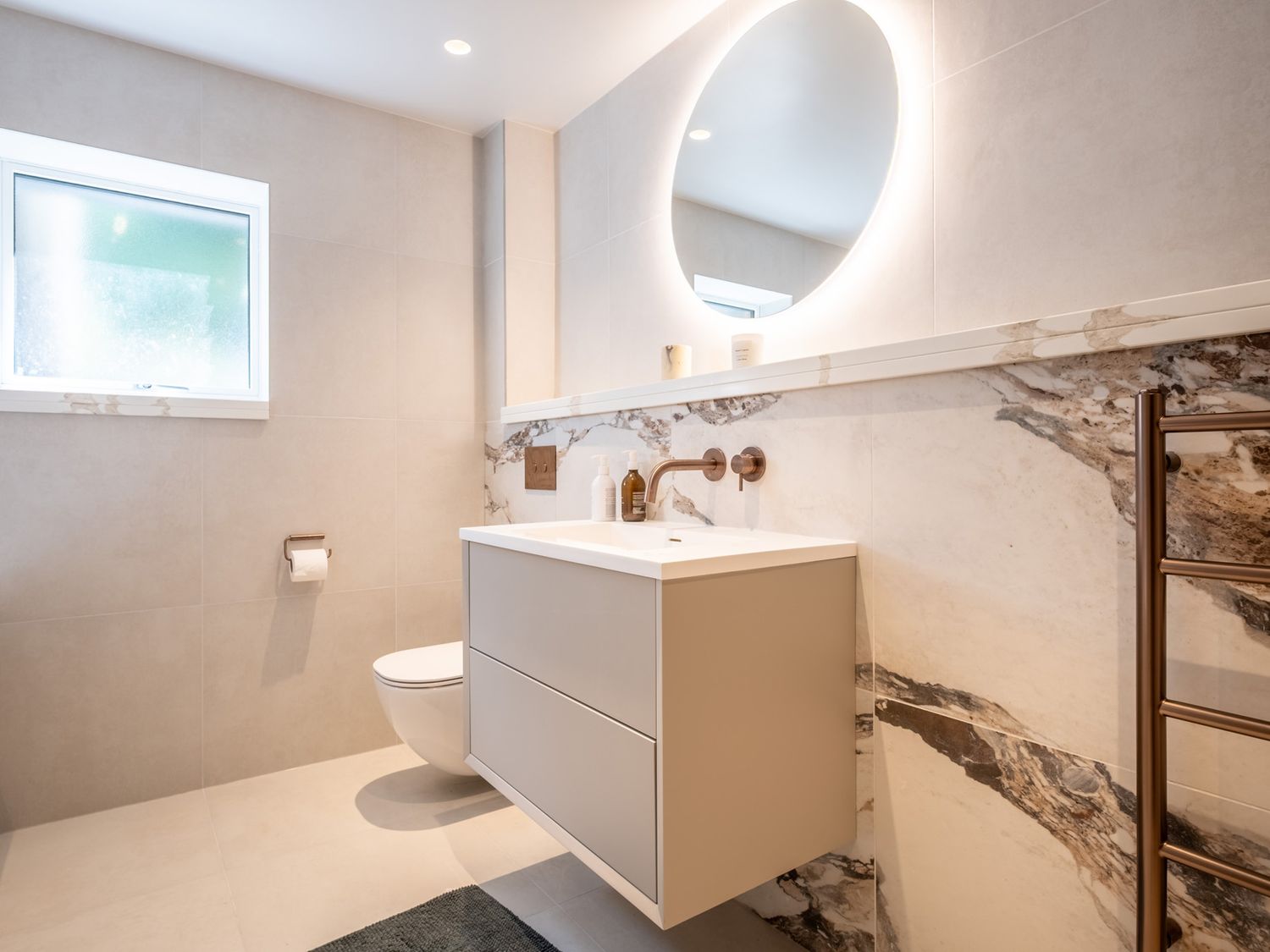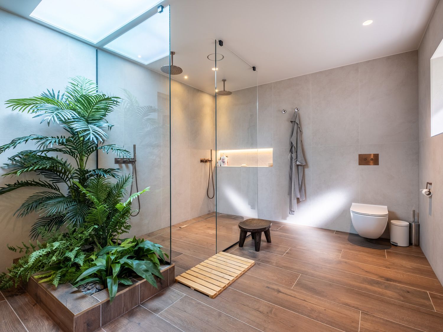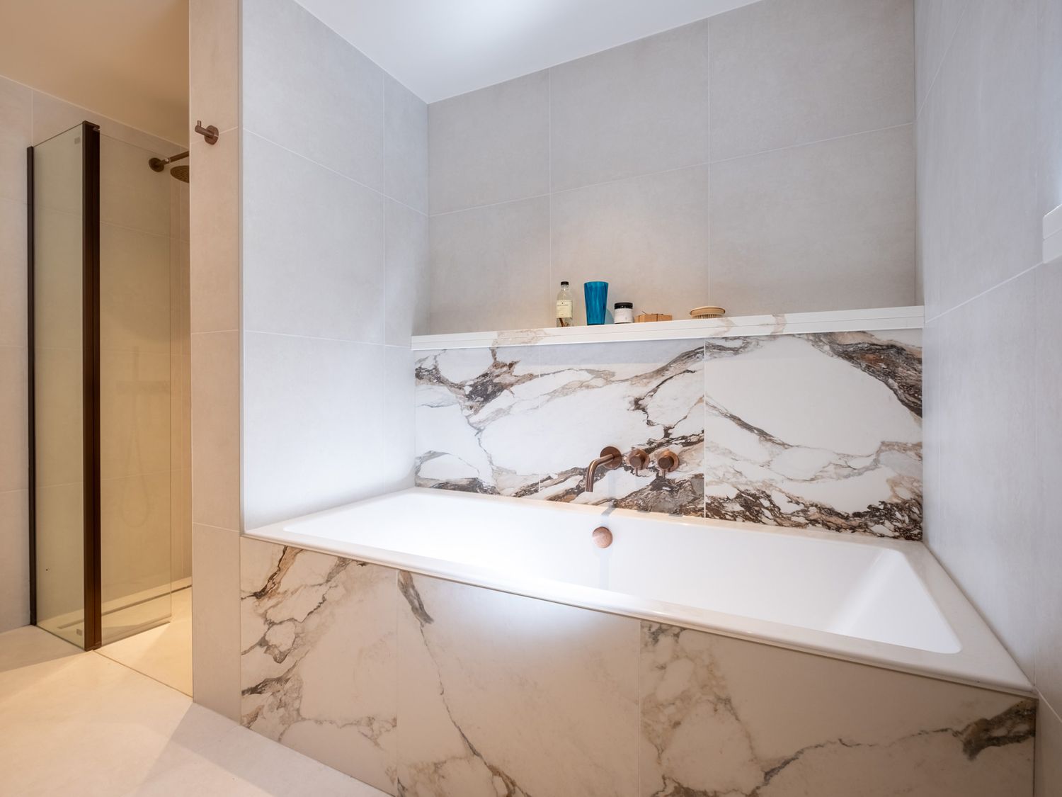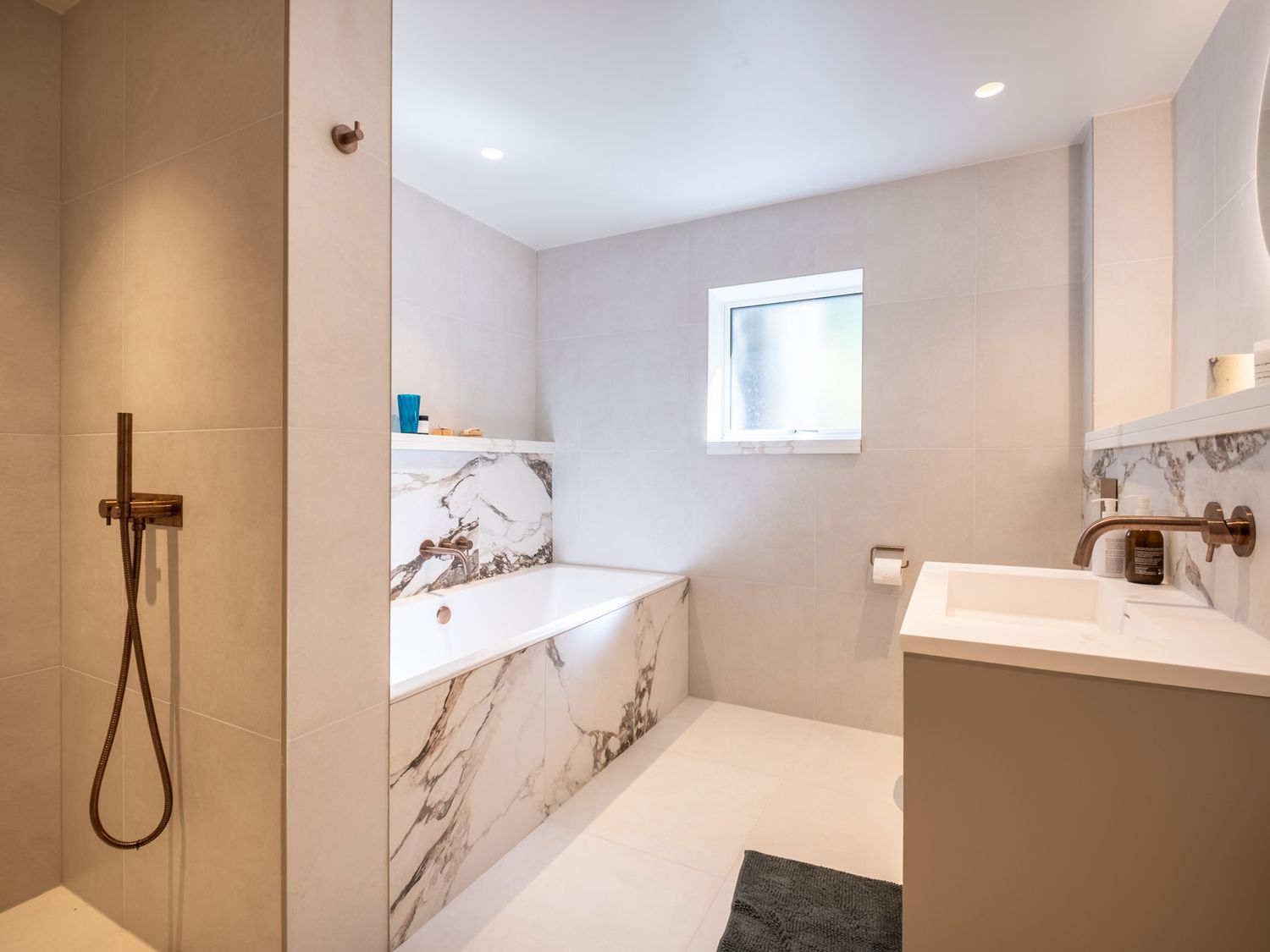 Bathroom with bath, walk-in shower, basin, heated towel rail, and WC.