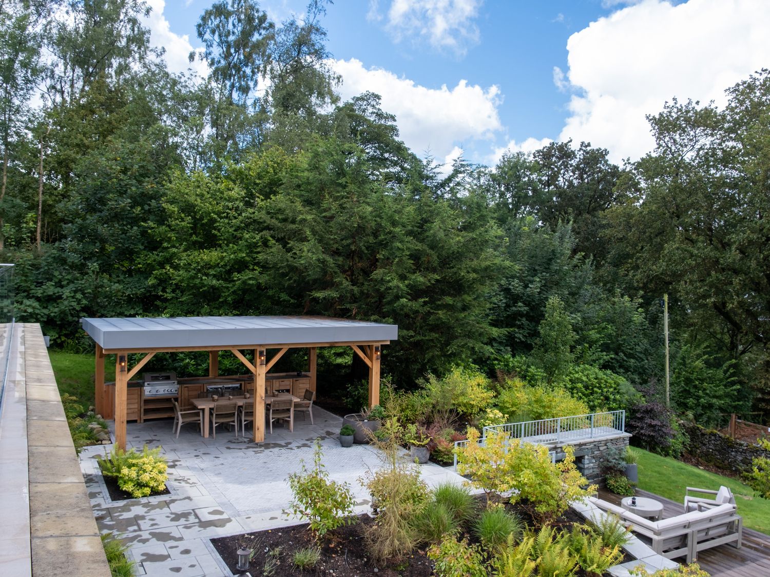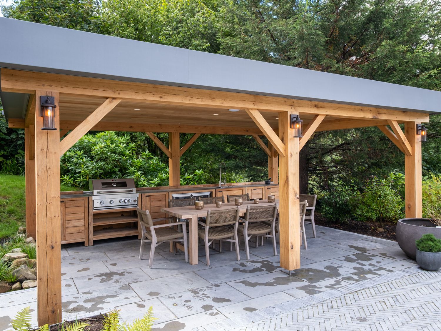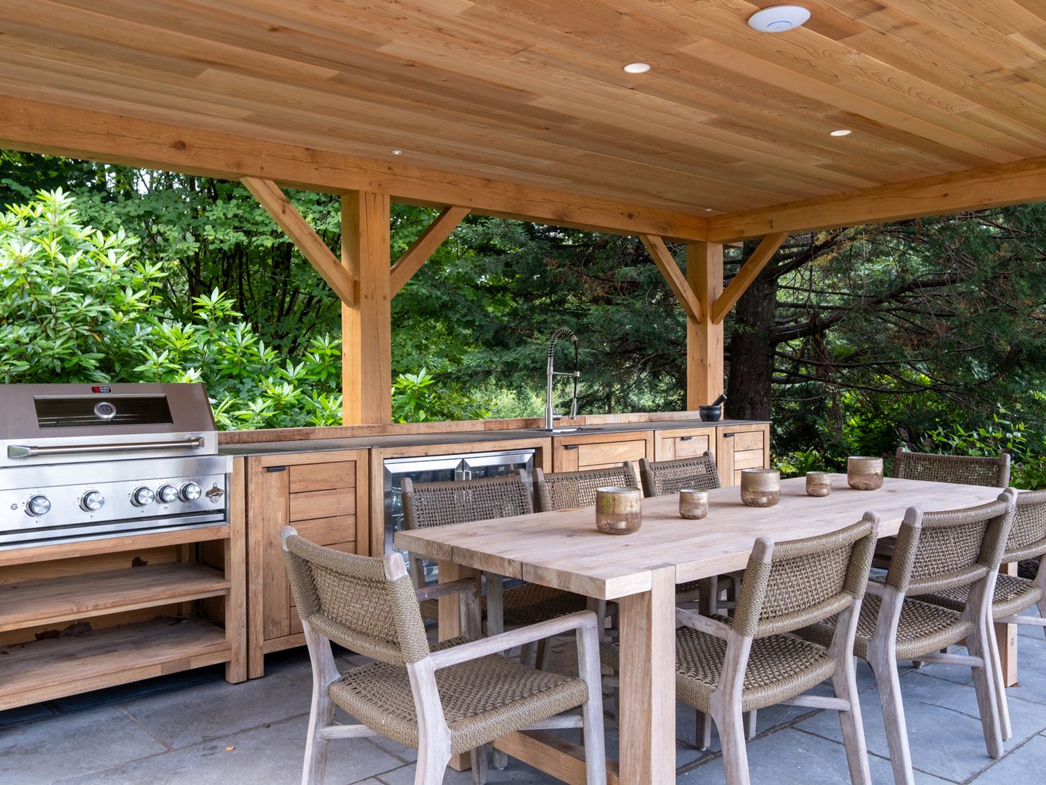Outdoor undercover entertainment area with dining table for 8 along with a kitchen area including barbecue and fridges.