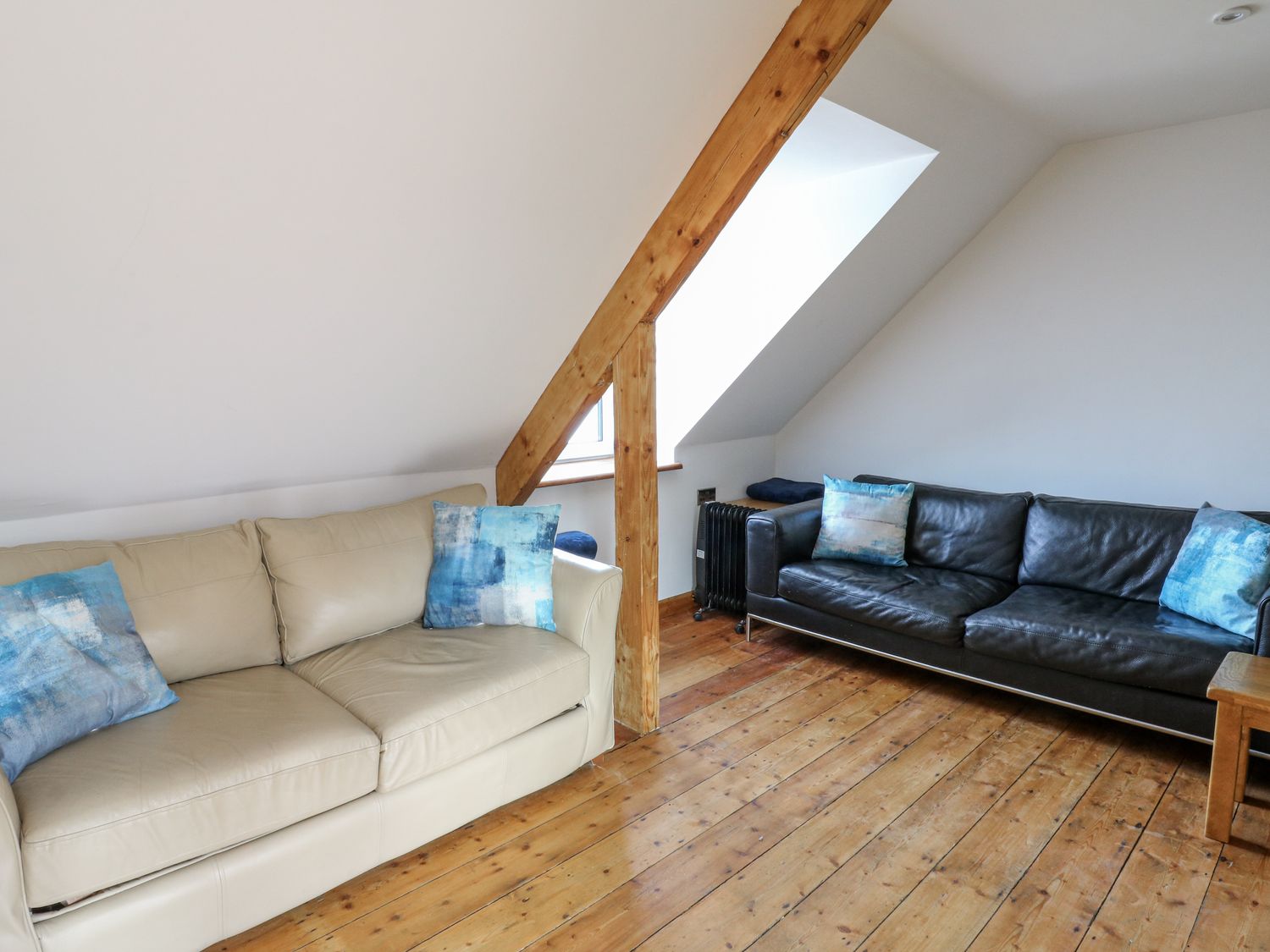 "Second-floor apartment. Two bedrooms: 1 x king-size with en-suite freestanding bath, basin and WC, 1 x twin. Shower room with walk-in shower, basin and WC. Open-plan living space with kitchen, dining area and sitting area with sofa-bed (please bring your own bedding)"