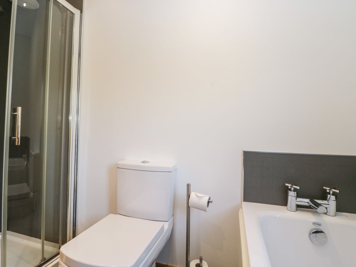 "Single-storey. Two bedrooms: 1 x double, 1 x twin. Bathroom with bath, walk-in shower, basin, heated towel rail and WC. Open-plan living space with kitchen, dining area, and sitting area, corner sofa