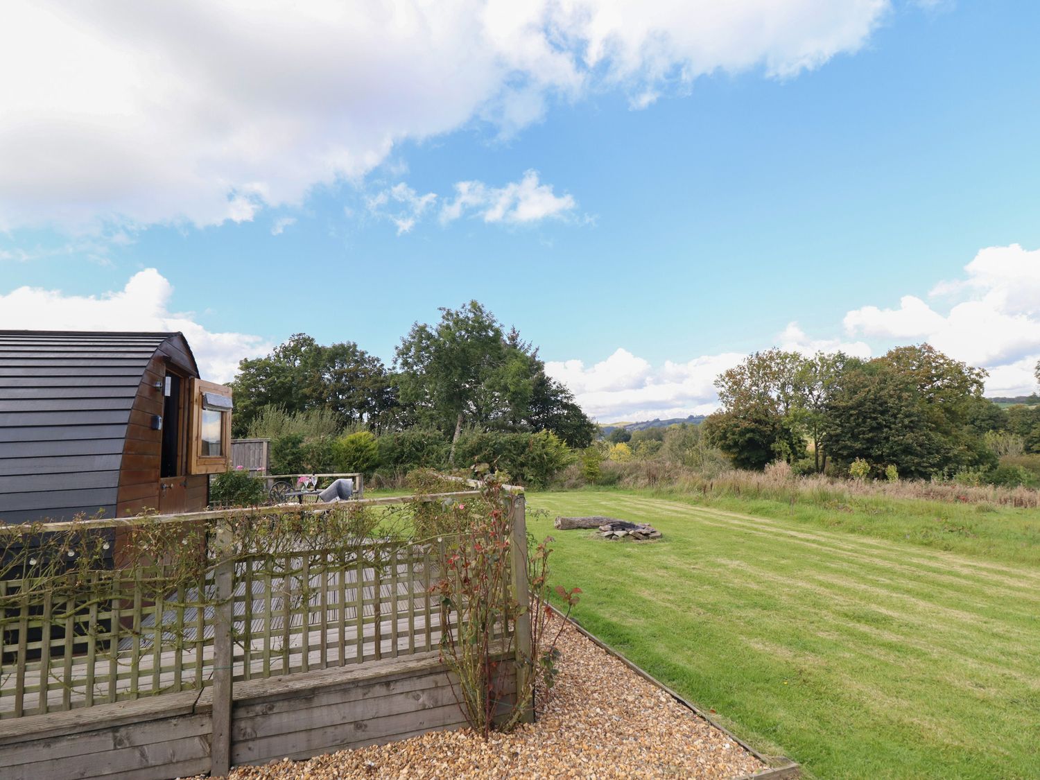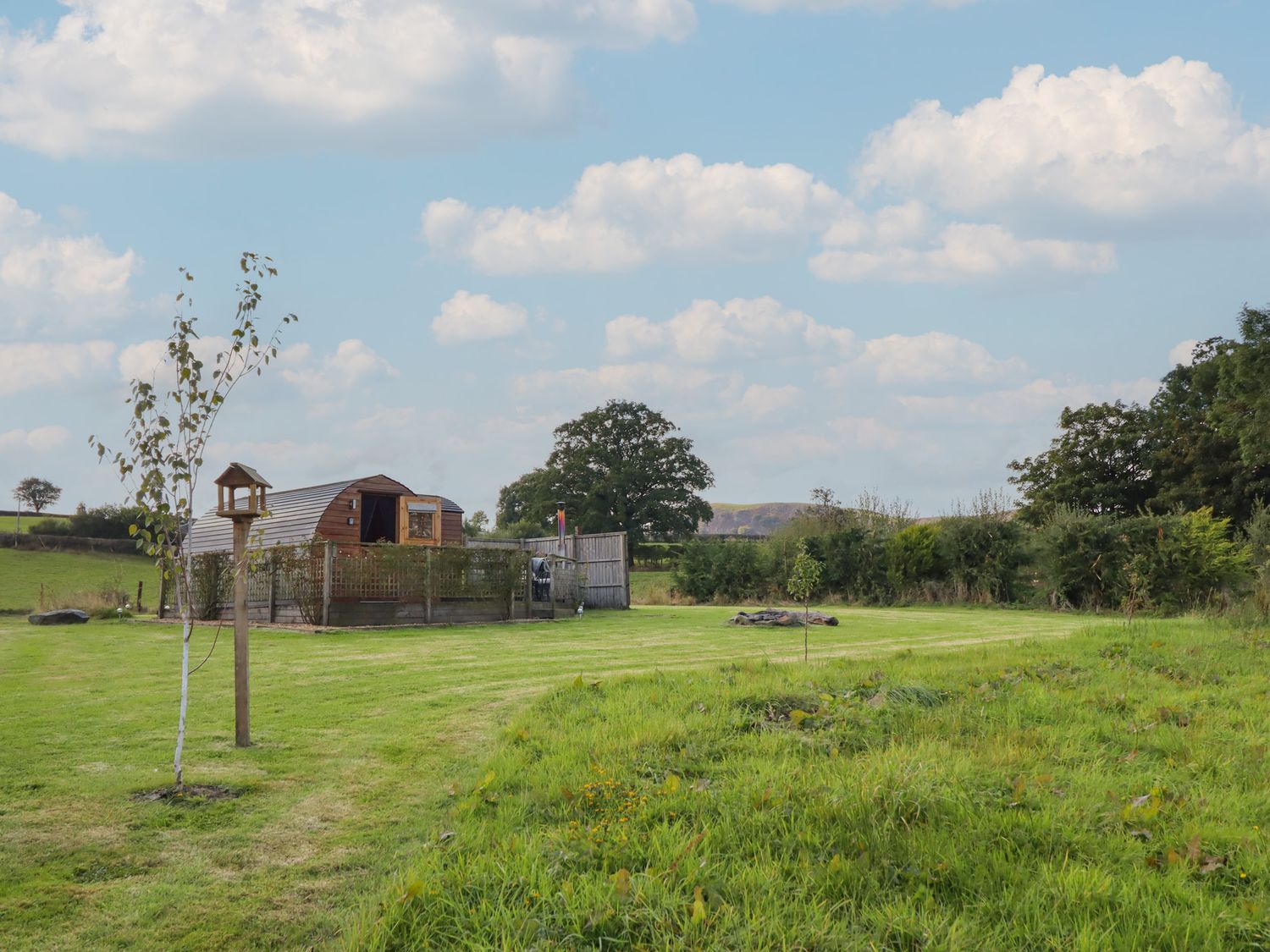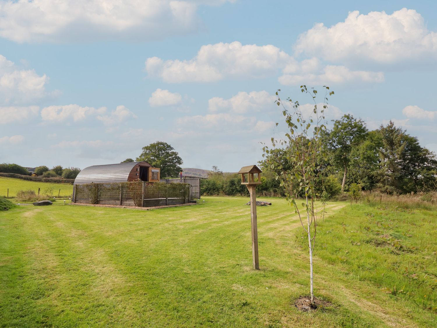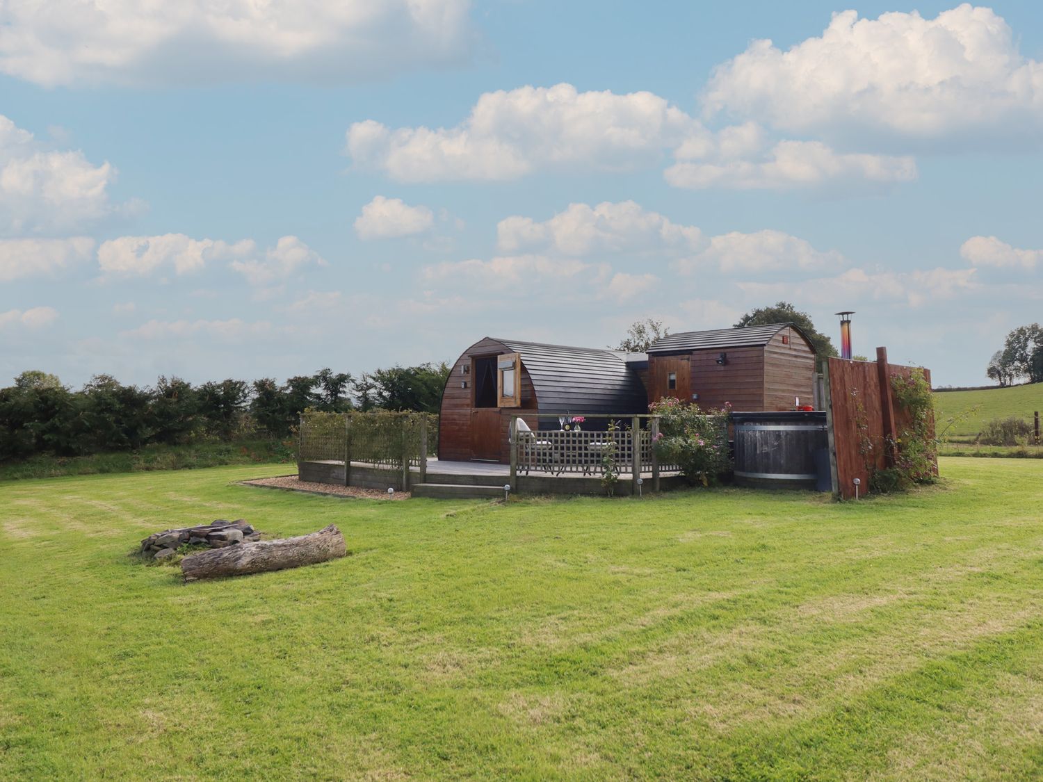 "Emden Pod at Banwy Glamping is a single-storey pod consisting of an open-plan living space with combi oven with a two-ring hob, fridge/freezer, TV, and dining seating for two people. There is a king-size bed with en-suite shower room. Outside there is a decking with an outdoor seating area and a wood-fired hot tub, as well as use of a private acre of land. Off-road parking is available. Only one well-behaved dog is welcome. You'll find a shop in 3.3 miles, pub in 3.4 miles, and lake in 1.5 miles. Fuel, power, bed linen, and power inc. in rent. Emden Pod at Banwy Glamping offers a wonderful romantic retreat to Welshpool. Note: Prior to arrival customers must become a member of Woodlands Champion Club, there is no charge for this. Please note, dogs are the only type of pet accepted at this property."