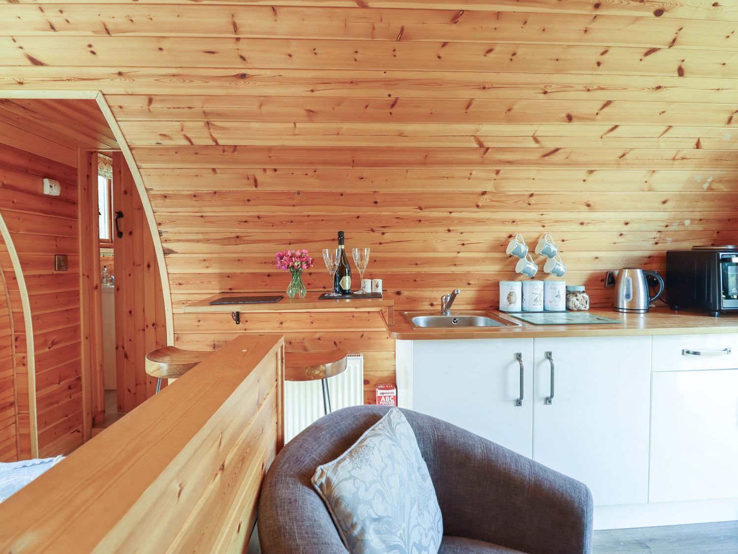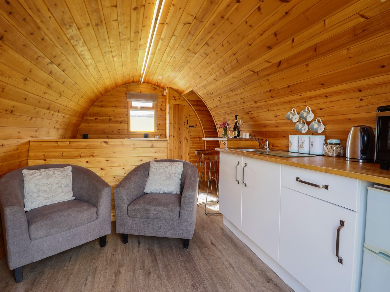 "Single-storey pod. Studio layout with king size double bed, en-suite shower, basin, heated towel rail and WC. Open-plan living space with kitchen, dining area, and sitting area"