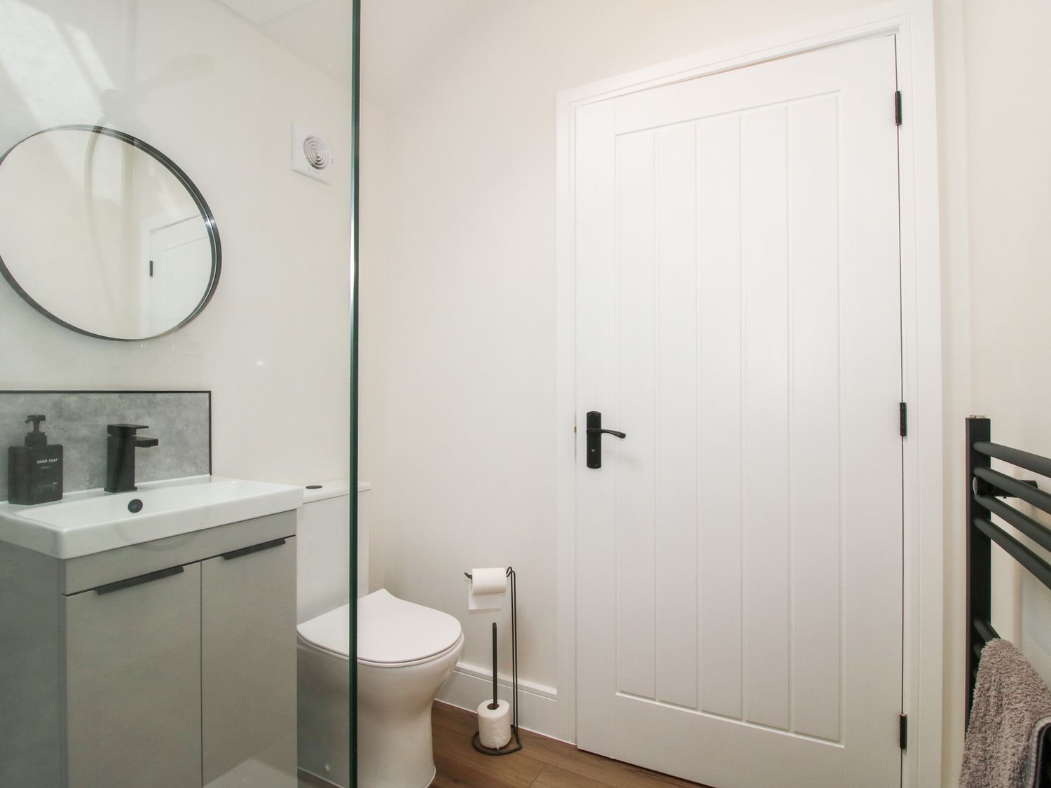 "Single-storey. One king-size bedroom. Shower room with walk-in shower, basin, heated towel rail and WC. Open-plan living space with kitchen, dining area, and sitting area"