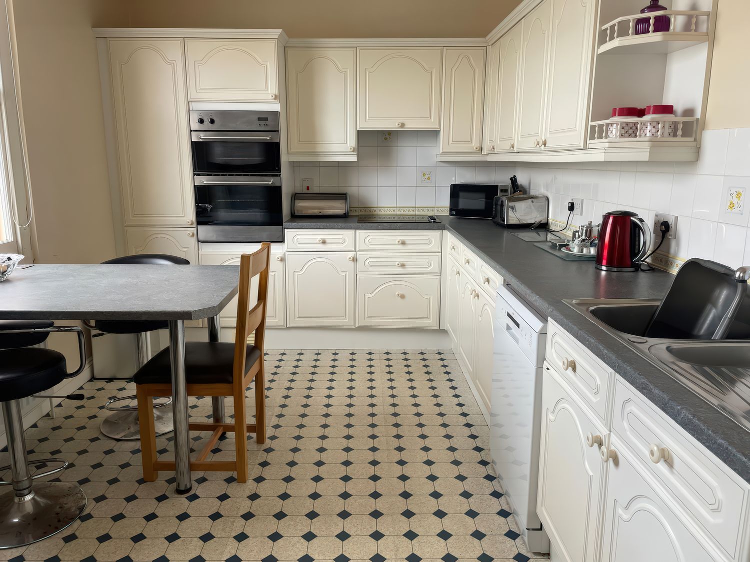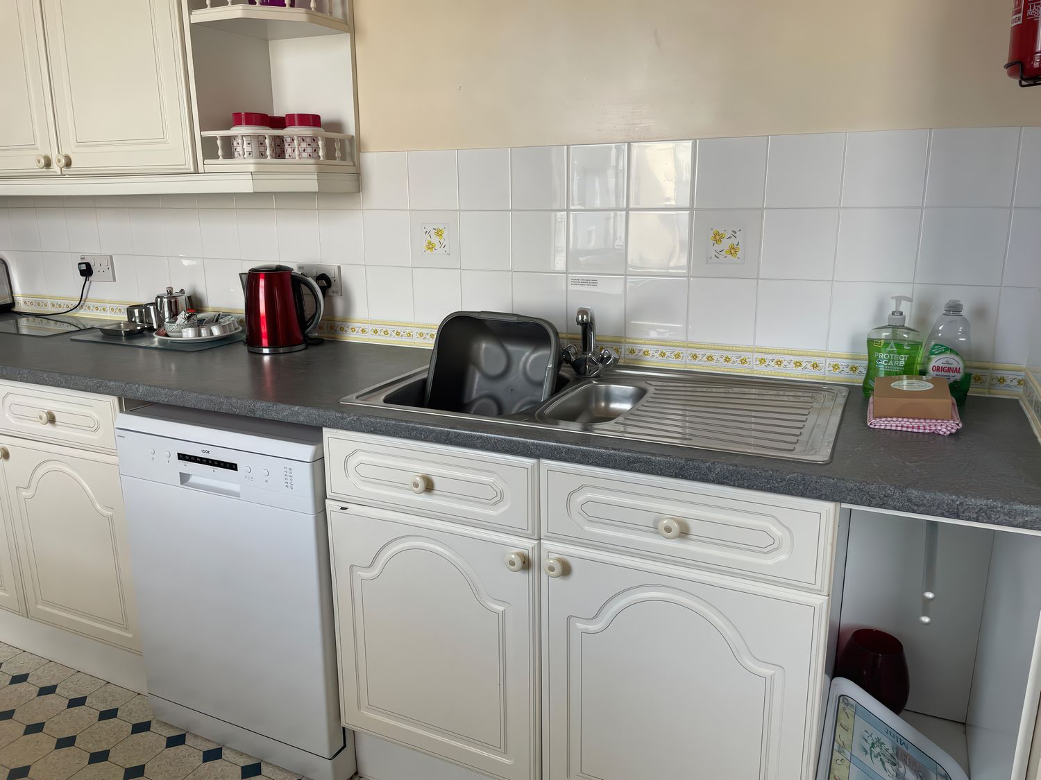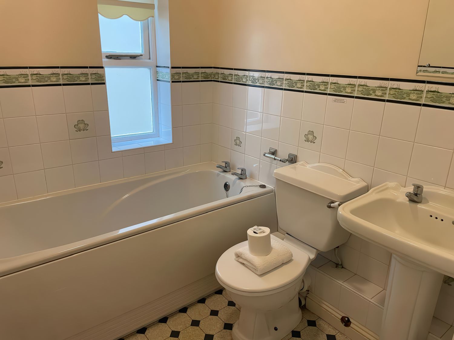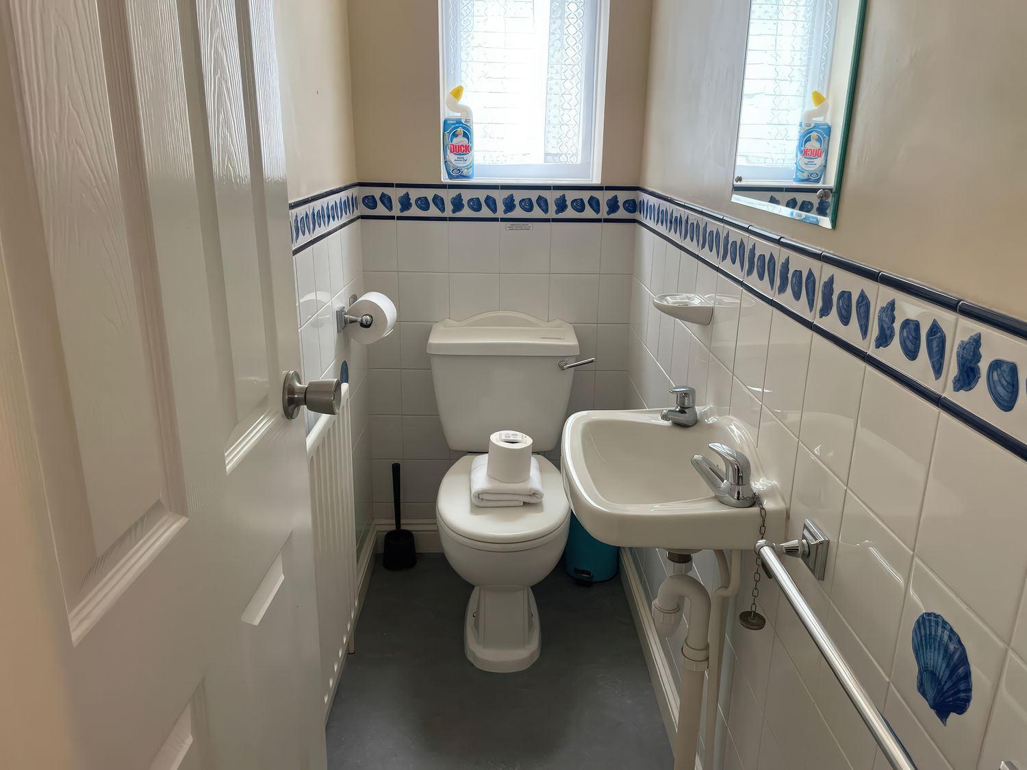 "Four bedrooms: 1 x ground floor double with en-suite shower, basin and WC, 1 x ground floor twin single with pull-out bed, 1 x ground floor single, 1 x first floor double with en-suite shower in the corner of the room. Ground floor bathroom with bath, basin and WC. Cloakroom with basin and WC accessed from the landing. First floor living area with kitchen with breakfast bar, dining area and sitting area with woodburner."