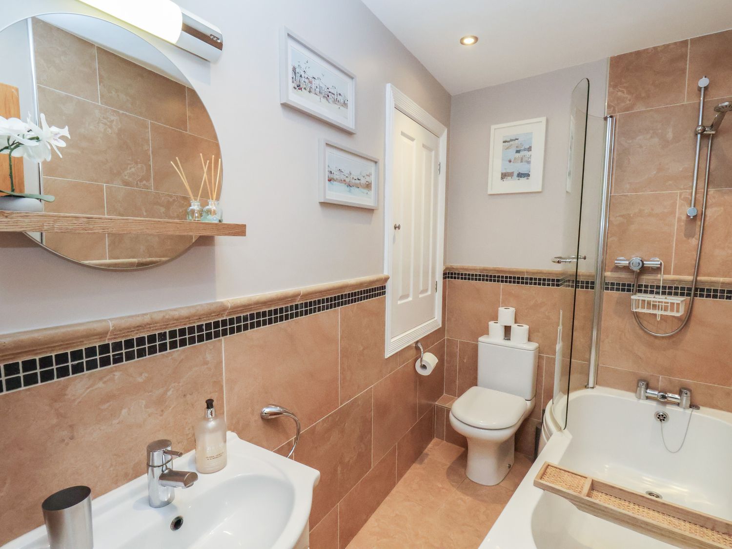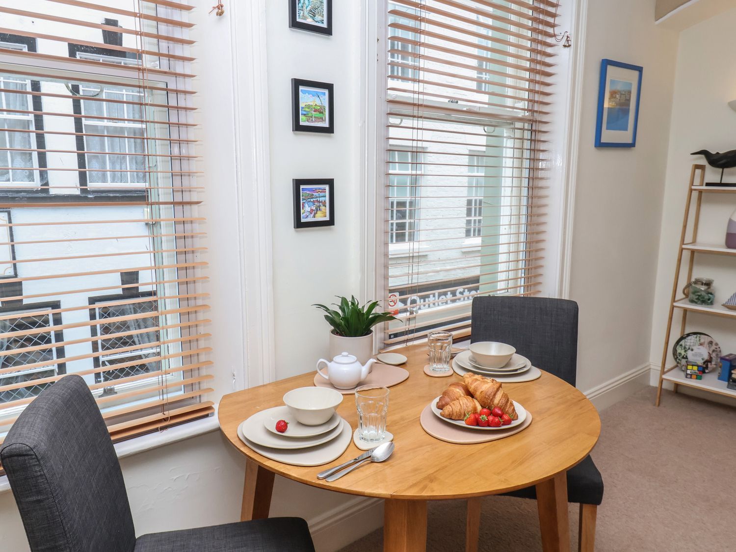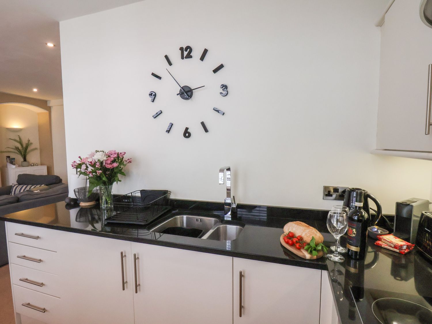 "First-floor apartment. One double bedroom with smart TV. Bathroom with bath, shower over, basin, WC. Open-plan living space with kitchen, dining area, and sitting area"