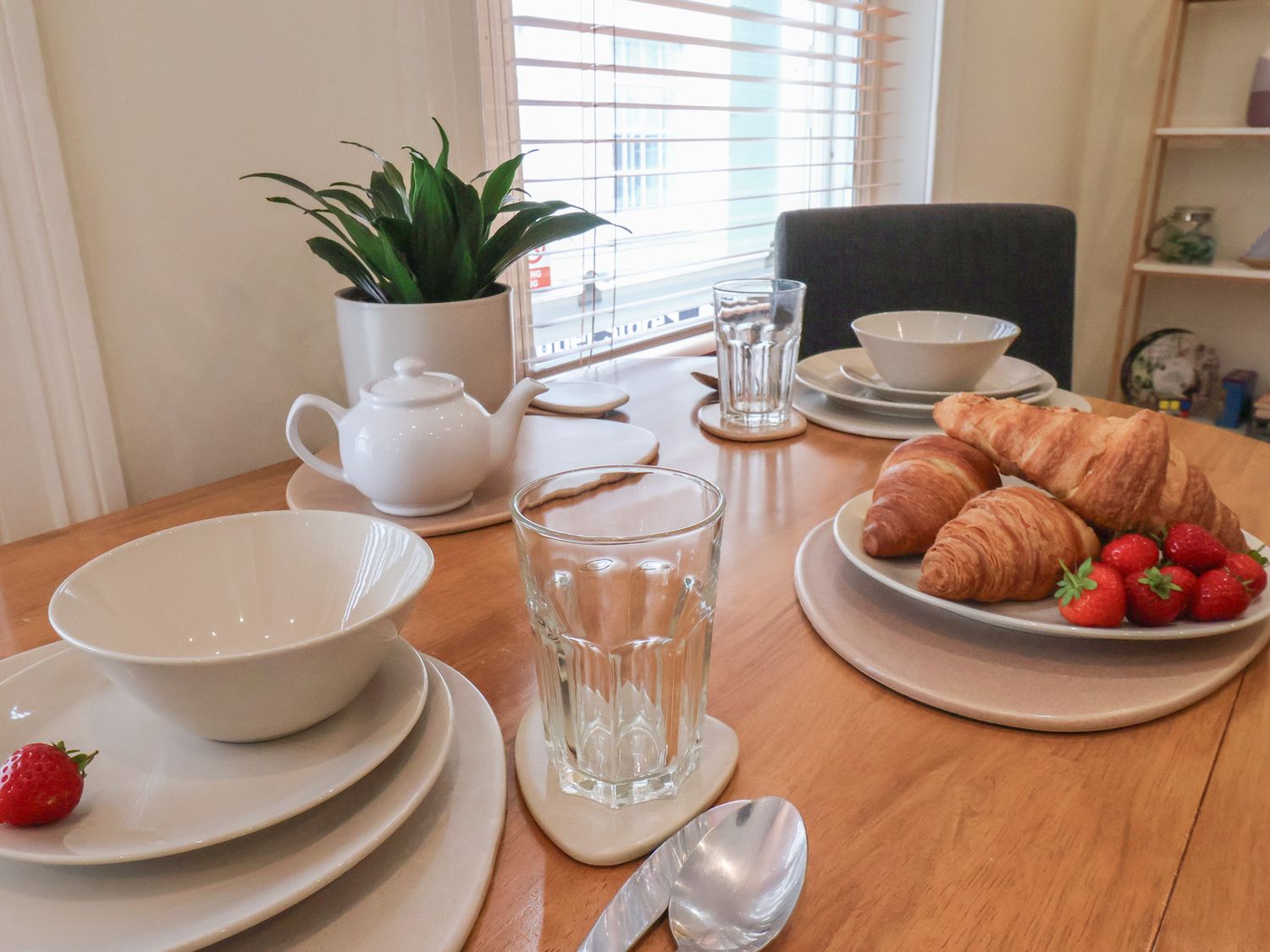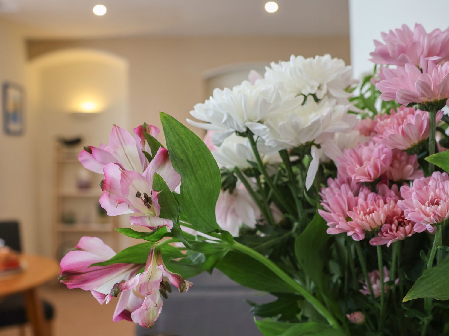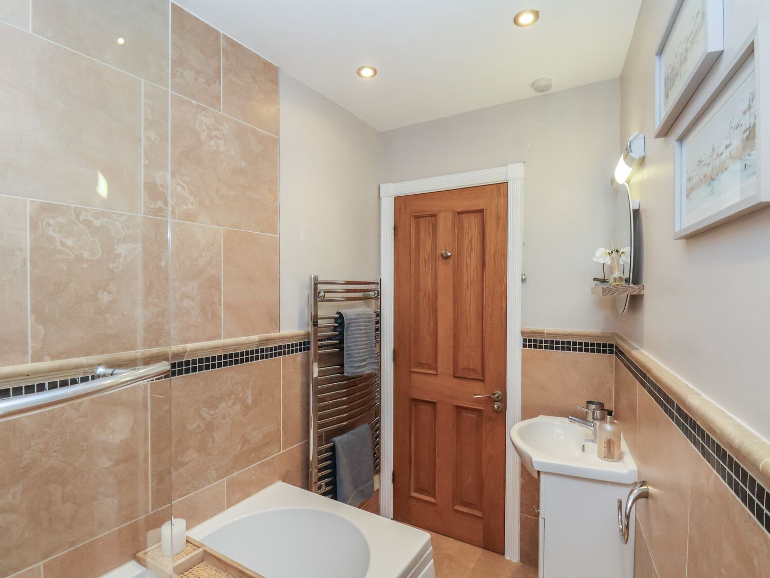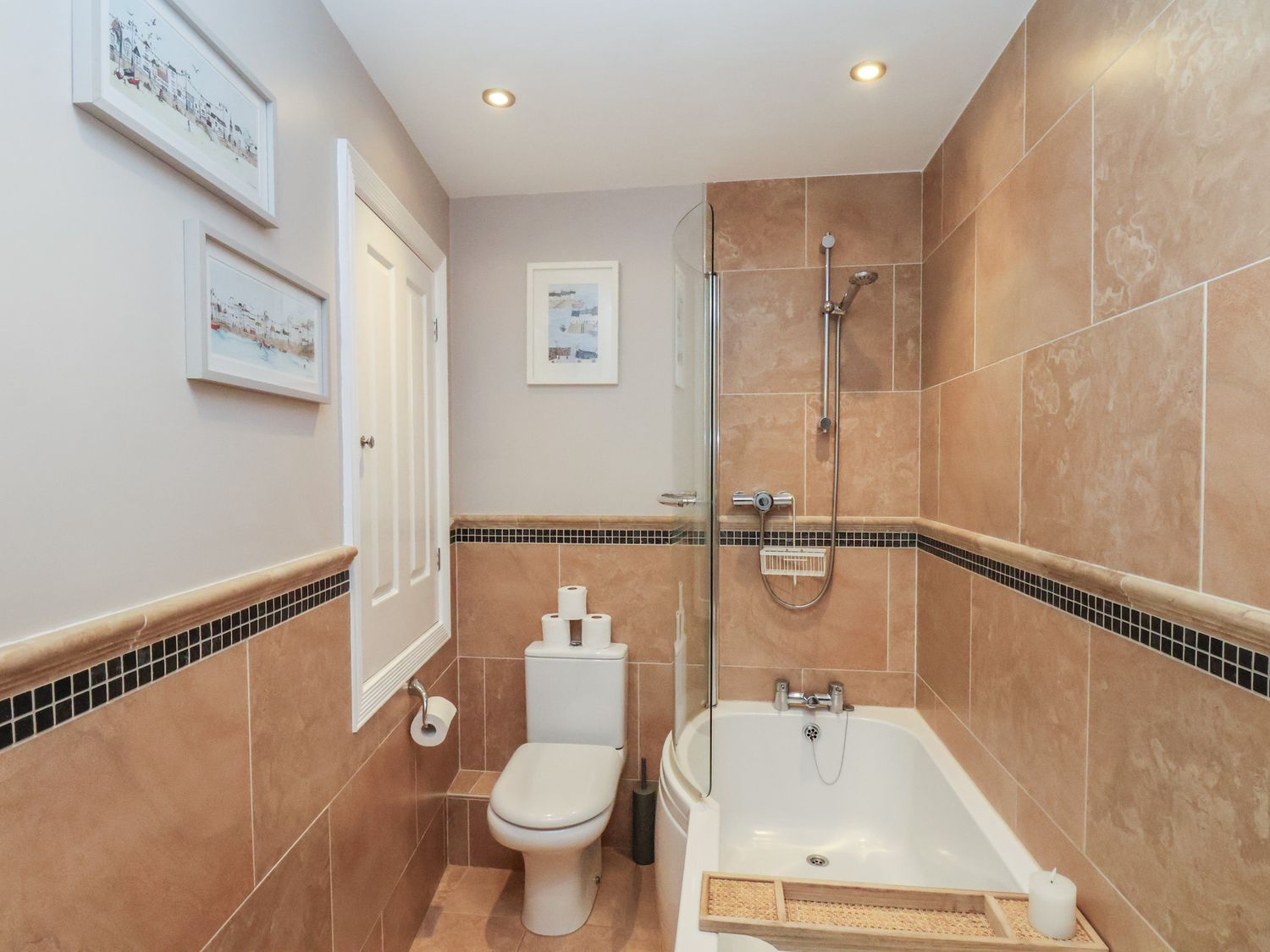 "First-floor apartment. One double bedroom with smart TV. Bathroom with bath, shower over, basin, WC. Open-plan living space with kitchen, dining area, and sitting area"