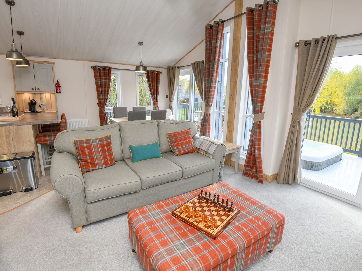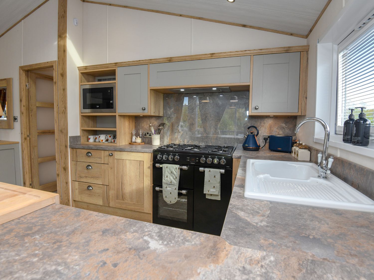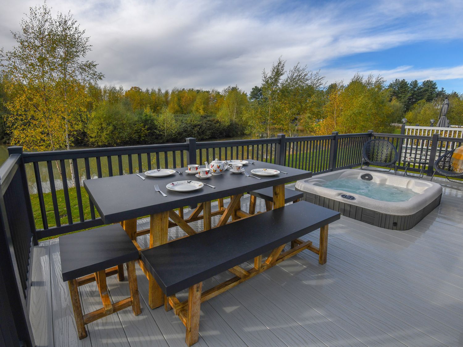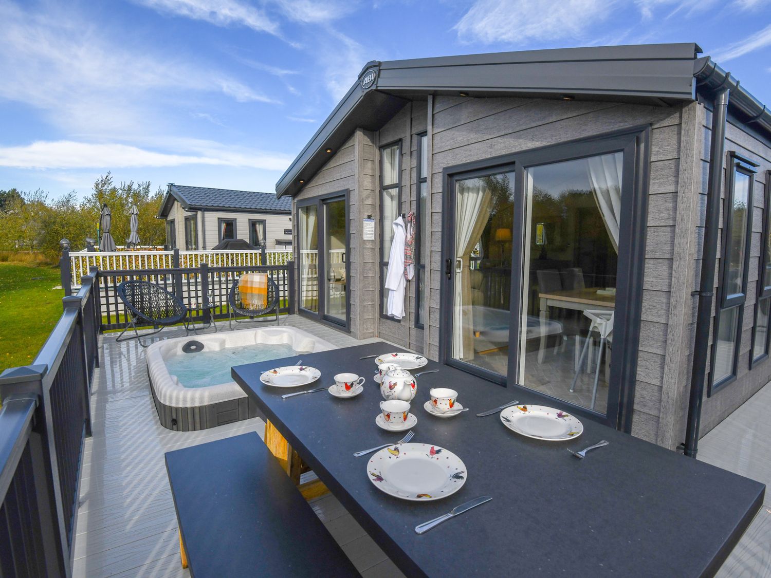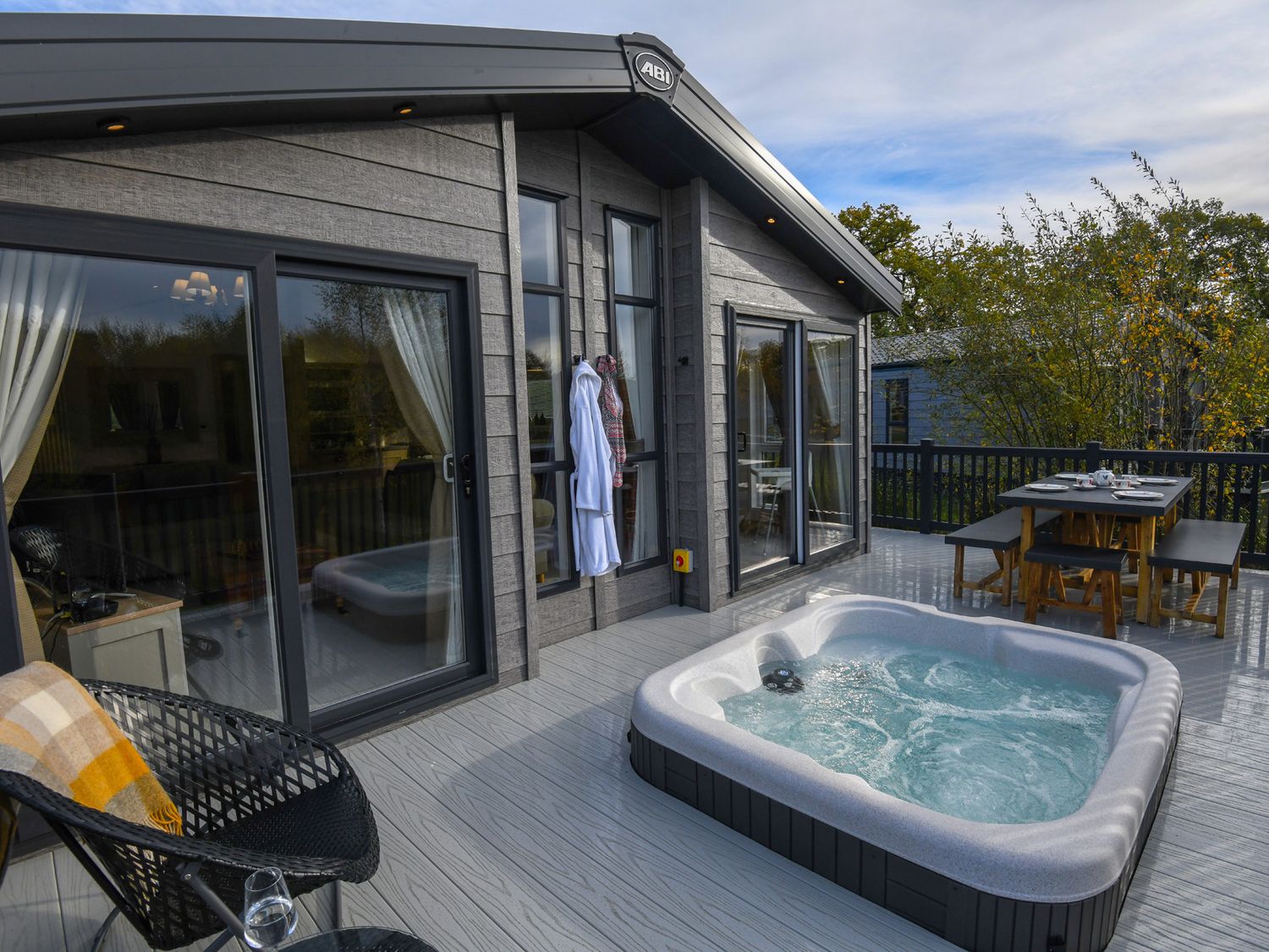 "Lakewood Retreat consists of an open-plan living space with kitchen, dining and sitting area, a bathroom with bath, shower over, basin and WC, a shower room with walk-in shower, basin, heated towel rail and WC, and two bedrooms: a double and a twin. Central heating. Oven, hob, microwave, fridge, kettle, toaster. Smart TV, WiFi. Fuel, power, bed linen and towels are all included in the price. Highchair available. Off-road parking. Enclosed decking with furniture and hot tub. Pet-friendly. Sorry, no smoking. Shop and pub 0.7 miles. Enjoy a lovely stay at Lakewood Retreat."
